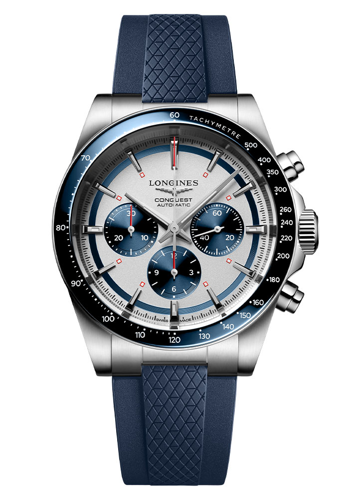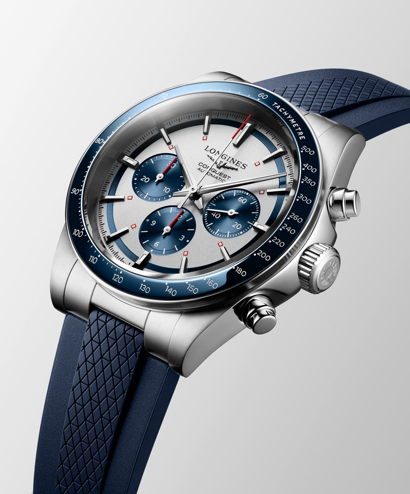 Přední strana je vyrobena z nejkvalitnějšího safírového skla s antireflexní vrstvou, která odráží světlo a zvyšuje čitelnost číselníku. Lesklý číselník ve stříbrné barvě je zdoben slunečním brusem. Aktuální čas ukazují rhodiované ručičky a aplikované indexy. Při slabém osvětlení usnadňuje čtení času vrstva Super-LumiNova®, která na hodinových značkách 3, 6, 9 a 12 vytváří jednotný a elegantní celek. Kontrastní keramický rámeček s tachymetrovou stupnicí a subčíselníky malé sekundovky a čítačů chronografu doplňují sportovní charakter hodinek. Bohatá funkčnost tohoto luxusního časoměru Longines je poháněna automatickým mechanismem – kalibrem L898.5 vyrobeným speciálně pro Longines, s rezervou chodu až 59 hodin, křemíkovým vláknem setrvačky a komponenty odolnými vůči působení magnetických polí.