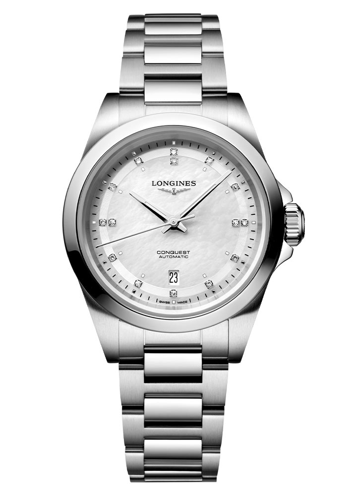 K příležitosti jubilea 70 let od uvedení řady Conquest byla tato řada obohacena o nové verze, které kombinují sportovní eleganci, nadčasový design a pokročilá řešení ideální pro každodenní použití. Jednou z těchto verzí je dámské hodinky Longines Conquest L3.320.4.87.6, vynikající svými oslnivými diamanty. Tyto hodinky mají 15 pravých diamantů Top Wesselton VS-SI na perlově unikátním ciferníku. Jemné značky kolem diamantů na ciferníku a rhodiově zlatěné a leštěné hodinové a minutové ručičky jsou pokryté vrstvou Super-LumiNova®, což zajišťuje optimální čitelnost v jakoukoli denní dobu. Bezchybný časový odečet podporuje odolné safírové sklo s antireflexní úpravou na obou stranách, chránící proti poškrábání.