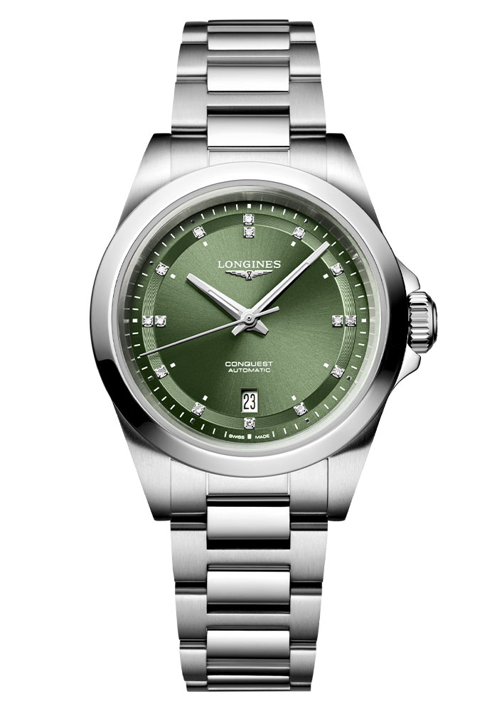 Na přední straně pouzdra je vysoce odolné proti poškrábání safírové sklo s antireflexní úpravou, která odráží světelné paprsky, což zvyšuje čitelnost ciferníku. Pod sklem se nachází zelený ciferník se slunečním brusem. Na lesklém ciferníku jsou čitelné ručky a 15 pravých diamantů. Tyto ušlechtilé kameny, které jsou nazývány pravými přáteli každé ženy, jsou pečlivě uspořádány na celých hodinových bodech. Diamanty doplňují jemné indexy, které stejně jako ručky svítí ve tmě. Švýcarská Super-LumiNova® pomáhá číst aktuální čas za všech světelných podmínek. Funkčnost tohoto dámského modelu doplňuje datumovka, která na pozici šesté hodiny informuje o aktuálním dni v měsíci.