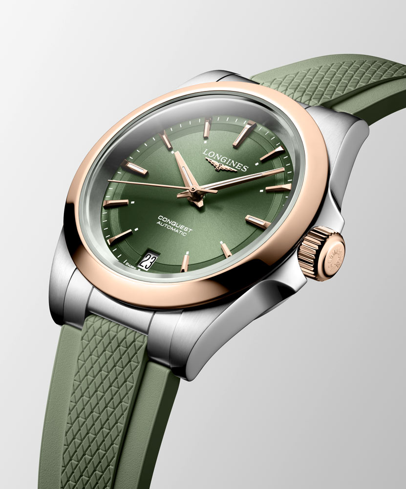 Dámské hodinky Longines Conquest Lady L34305029 jsou nabízeny ve skutečně ženské velikosti 34 mm. Solidní konstrukce tohoto sportovního modelu zajišťuje vodotěsnost do hloubky 100 metrů. Hodinky Longines mohou doprovázet svou majitelku při plavání, aniž by došlo k poškození mechanismu. Pouzdro uzavírá našroubovaný zadní kryt s průhledným safírovým sklem. Značka Longines své hodinky doplnila o elastický gumový řemínek v zelené barvě. Motýlkové zapínání řemínku zajišťuje pohodlí a komfort při nošení.