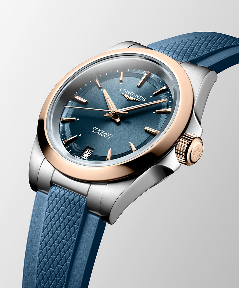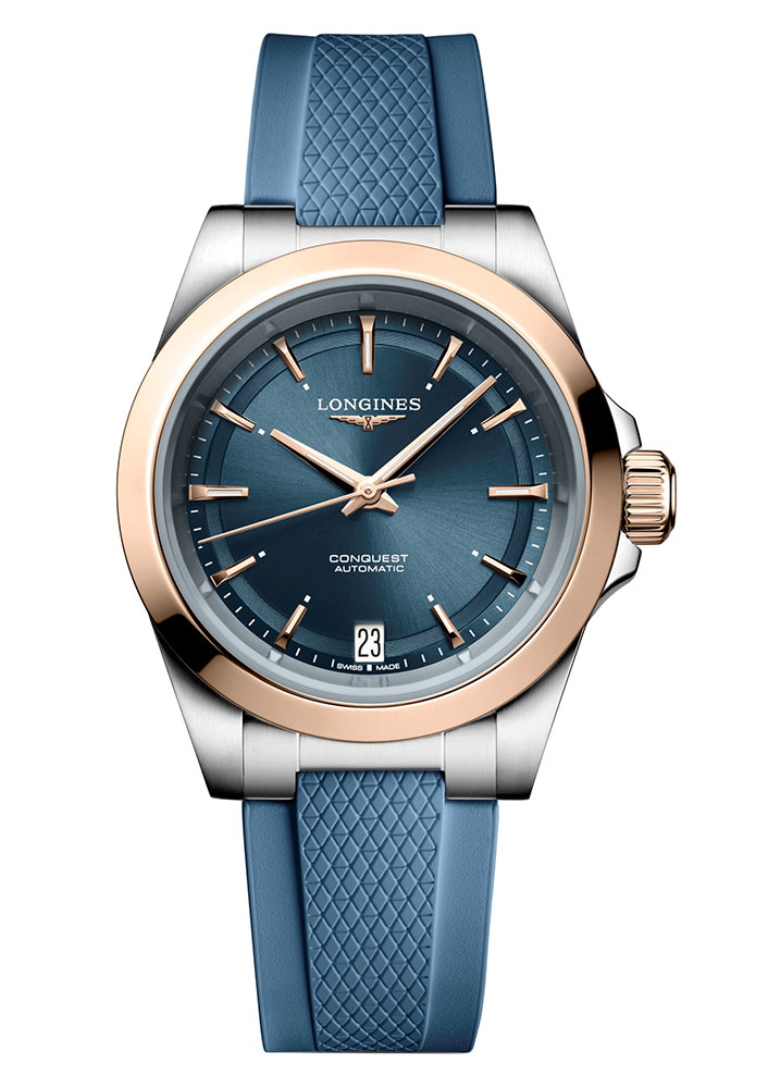 K příležitosti 70. výročí premiéry řady Conquest byla rozšířena o nové verze, které spojují sportovní eleganci, nadčasový design a pokročilá řešení ideální pro každodenní použití. Jedním z nich je dámské hodinky Longines Conquest Lady L3.430.5.92.9, vynikající elegantní modrou ciferníkem se šnekovým broušením. Tyto hodinky mají jedenáct aplikovaných zlatých indexů hodin a okénko datumu na 6. hodině. Označení hodin a zlaté, leštěné ručičky pro hodiny a minuty jsou pokryty pokrytím Super-LumiNova®, což zajišťuje optimální čitelnost ve dne v noci. Bezchybné čtení podporuje odolné proti poškrábání safírové sklo s vícevrstvou antireflexní úpravou na obou stranách.