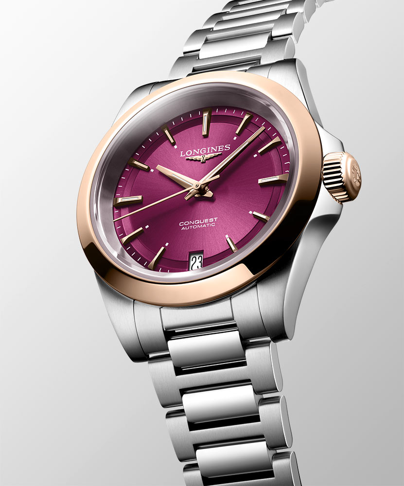 K příležitosti 70. výročí premiéry řady Conquest byla tato řada obohacena o nové verze, které kombinují sportovní eleganci, nadčasový design a pokročilá řešení ideální pro každodenní použití. Jedním z nich je dámské hodinky Longines Conquest Lady L3.430.5.98.6, které se vyznačují elegantní burgundskou ciferníkem se šnekovým vzorem. Tento hodinky mají jedenáct narážených zlatých hodinových indexů a datové okénko na pozici 6 hodin. Hodinové značky a zlaté, leštěné hodinové a minutové ručičky jsou pokryty pokročilou povrchovou úpravou Super-LumiNova®, což zajišťuje optimální čitelnost v jakoukoli denní dobu. Dokonalou čitelnost podporuje odolné proti poškrábání safírové sklo s antireflexním vícevrstvým povlakem na obou stranách.