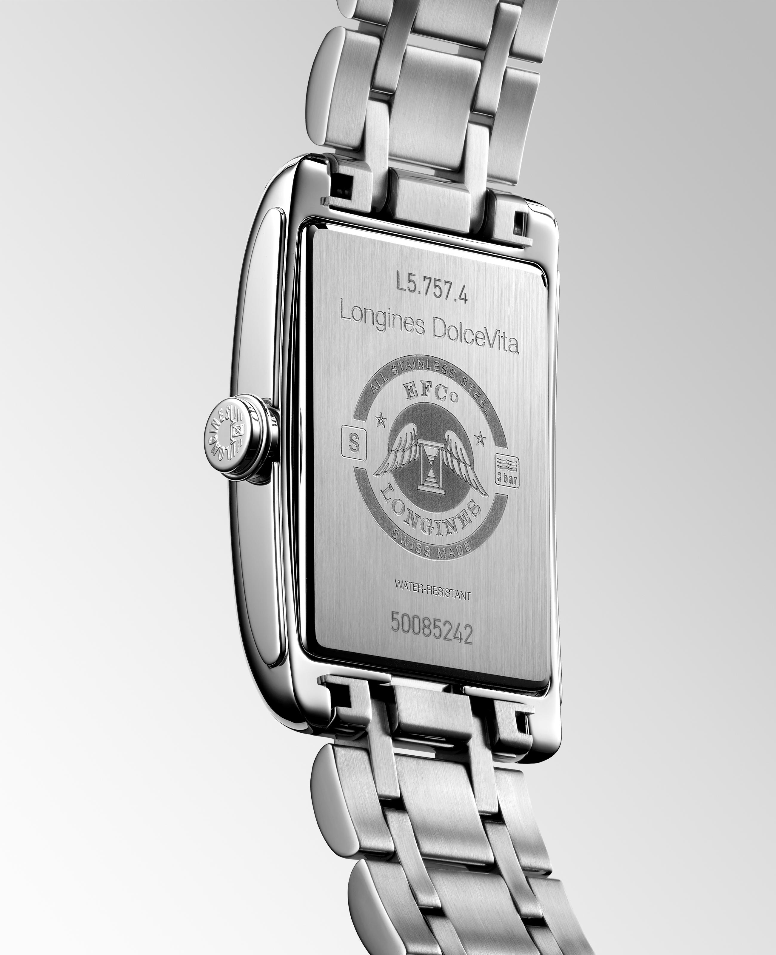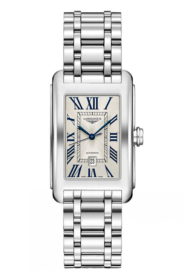Longines DolceVita Automatic L5.757.4.71.6 – elegance pro dnešní dobu. Obdélníkové hodinky Longines v sobě spojují čistotu a eleganci modelu z 30. let s designem 50. let ve skvěle zpracovaných detailech. Propracovanost, rafinovanost, jemnost, odlišnost jsou pojmy adekvátní jedinečnému duchu této řady. Designéři a hodináři Longines, inspirovaní čistotou geometrických linií, je důsledně převádějí do světa estetické dokonalosti. Krásně zdobený ciferník stříbrné barvy s modrými římskými číslicemi a ručičkami zaujme nejen každou ženu, ale i každého muže. Díky univerzální velikosti pouzdra 27,70 x 43,80 mm si tyto hodinky zamilují ženy hledající větší obdélníkové hodinky a muži, kteří ocení klasickou eleganci. Uvnitř Longines DolceVita Automatic je spolehlivý automatický Machineek ETA 2000-1/A20.L01 s funkcí data v 6 hodin.