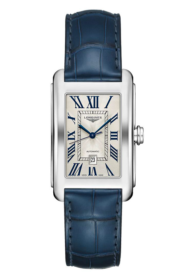 Longines DolceVita Automatic L5.757.4.71.9 – elegance pro dnešní dobu. Obdélníkové hodinky Longines v sobě spojují čistotu a eleganci modelu z 30. let s designem 50. let ve skvěle zpracovaných detailech. Propracovanost, rafinovanost, jemnost, odlišnost jsou pojmy adekvátní jedinečnému duchu této řady. Designéři a hodináři Longines, inspirovaní čistotou geometrických linií, je důsledně převádějí do světa estetické dokonalosti. Krásně zdobený ciferník stříbrné barvy s modrými římskými číslicemi a ručičkami zaujme nejen každou ženu, ale i každého muže. Díky univerzální velikosti pouzdra 27,70 x 43,80 mm si tyto hodinky zamilují ženy hledající větší obdélníkové hodinky a muži, kteří ocení klasickou eleganci. Uvnitř Longines DolceVita Automatic je spolehlivý automatický Machineek ETA 2000-1/A20.L01 s funkcí data v 6 hodin.