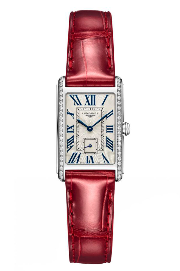 Elegantní švýcarské dámské hodinky Longines DolceVita. Obdélníkové pouzdro obohacené o 46 diamantů umístěných na zaoblených hranách. Tradiční ciferník s římskými číslicemi a vteřinovou ručičkou na 6. hodině. Křišťálově čisté safírové sklo, které je odolné proti poškrábání. Hodinky jsou nabízeny na řemínku z aligátoří kůže. Krásné detaily, jako je nádherné ocelové pouzdro a elegantní římské číslice, se dokonale hodí ke každému outfitu a dodávají mu prvek sofistikovaného stylu bez ohledu na příležitost.