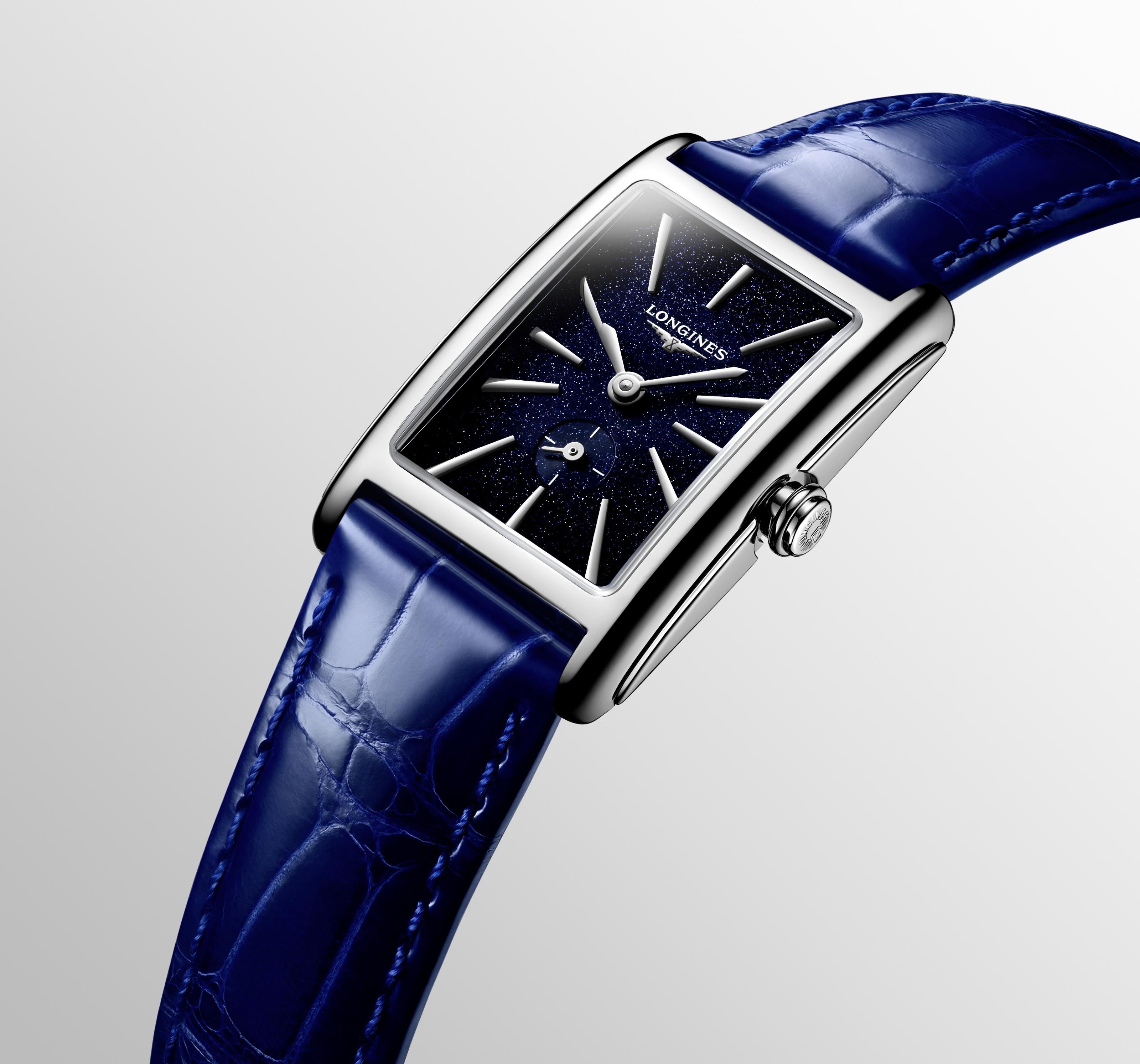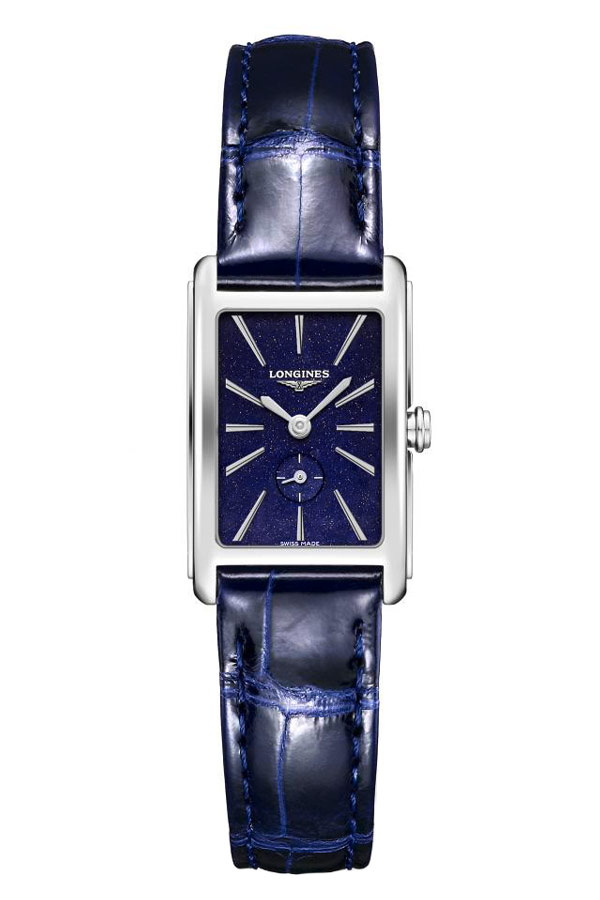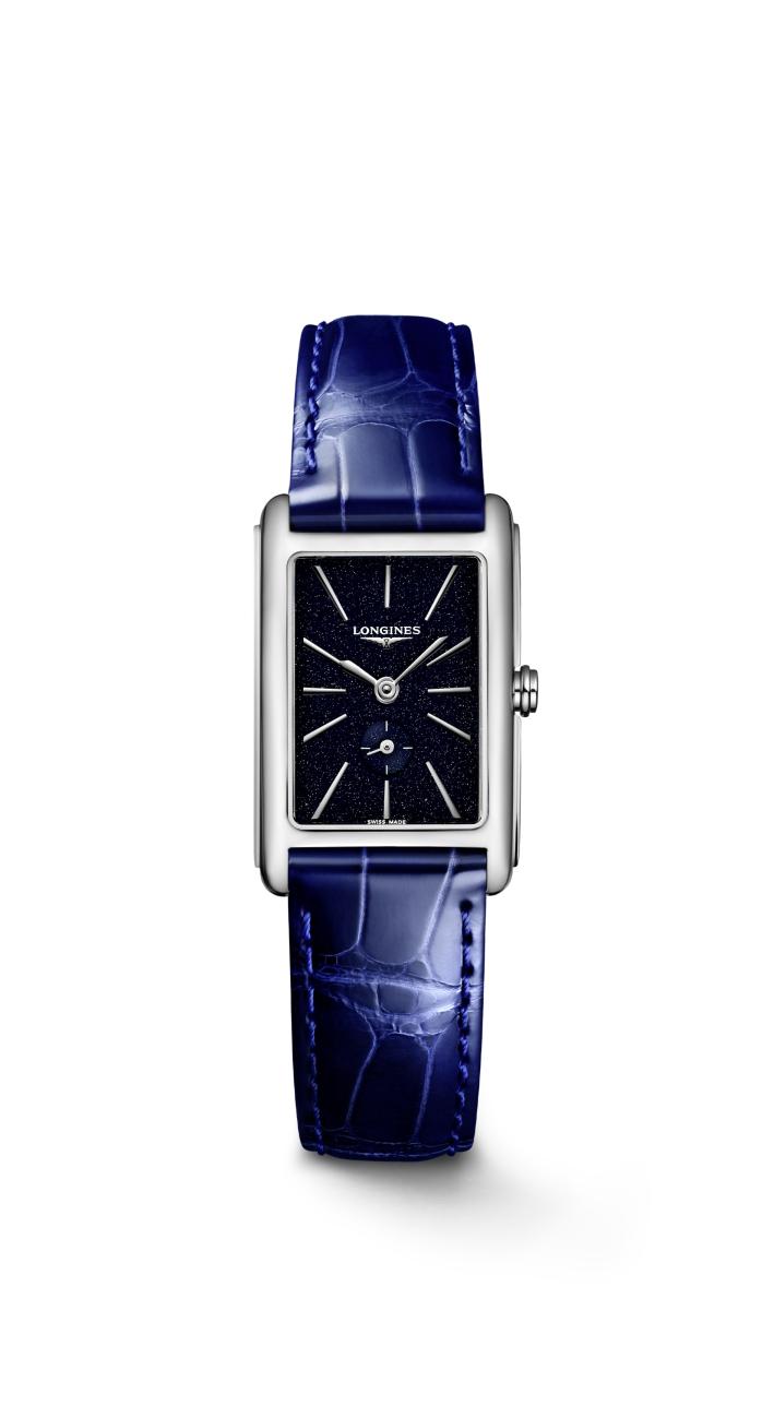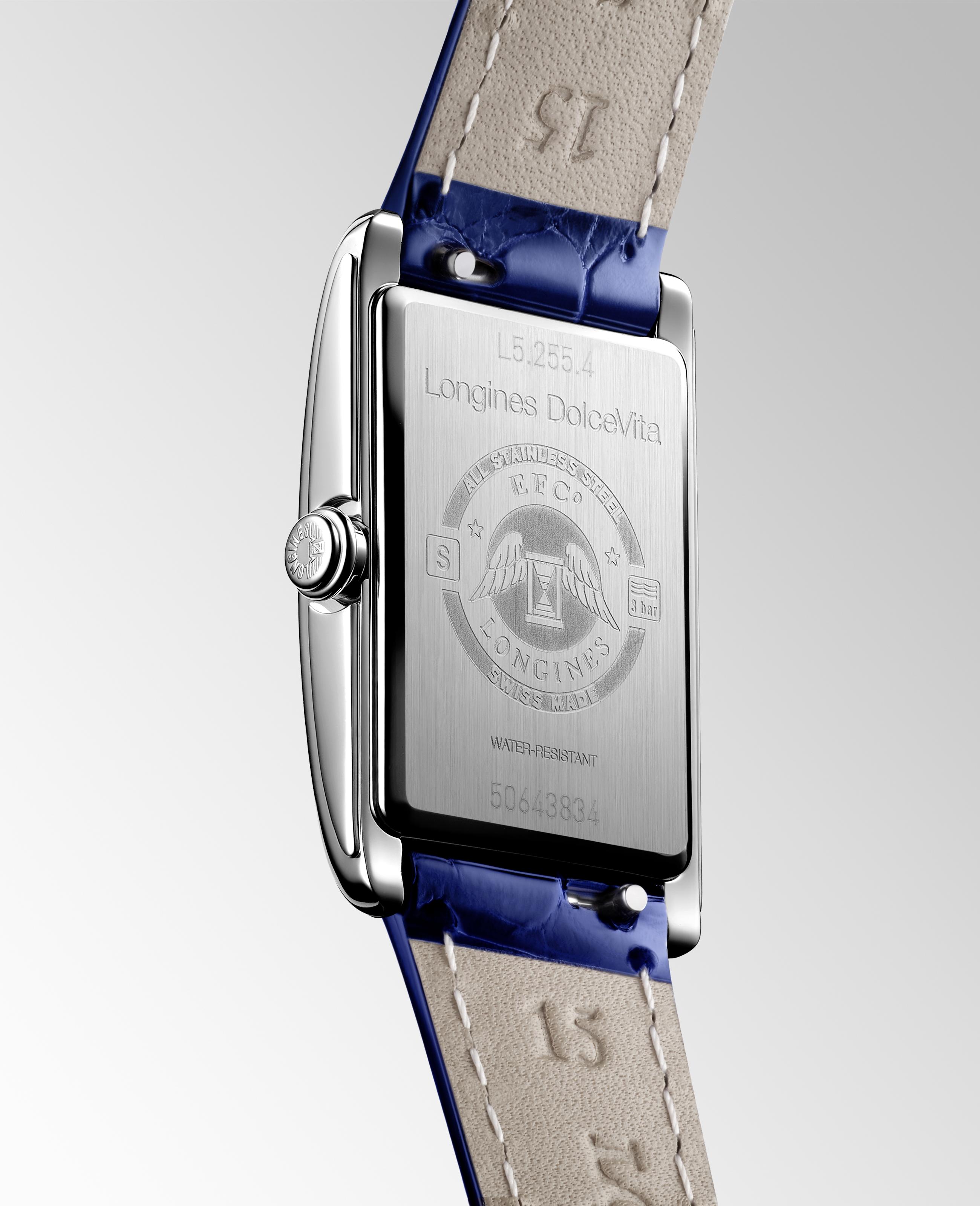 Dámské hodinky Longines DolceVita L5.255.4.93.2 inspirované „La Dolce Vita“ jsou ódou na sladkost života. Krásný nový půlnoční modrý ciferník s decentními třpytivými akcenty. Dlouhé, lesklé indexy dokonale ladí s elegantními ručičkami. Longines umístil na spodní část ciferníku malou vteřinovou ručku. Vysoce kvalitní řemínek z aligátoří kůže v námořnické modré barvě se vyznačuje rychloupínacím systémem a systémem popruhů na pouzdro. Pouzdro z leštěné nerezové oceli ve vysokém lesku měří shora 20,80 x 32 mm a je uzavřeno obdélníkovým safírovým sklem. Quartzový bateriový Machineek se systémem EOL zajišťuje přesnost chodu a má funkci upozornění na vybitou baterii, vteřinová ručka naskočí každé 4 sekundy.