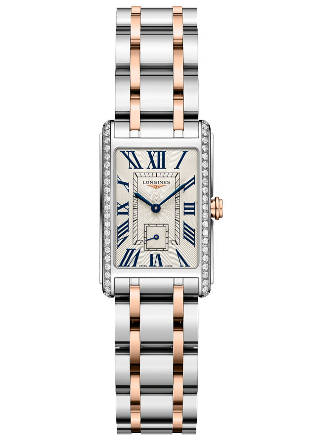 Elegantní, klasické, dámské hodinky Longines DolceVita. Stylové obdélníkové pouzdro z nerezové oceli, posázené diamanty. Ciferník krémové barvy s římskými číslicemi. Na ciferník se díváme přes tvrdé safírové sklíčko, které nepoškrábe. Hodinky Longines DolceVita jsou vybaveny základním hodnocením voděodolnosti, které vám umožní mýt si ruce a stříkat vodu. Pohodlný náramek vyrobený z nerezové oceli s prvky z 18karátového růžového zlata.