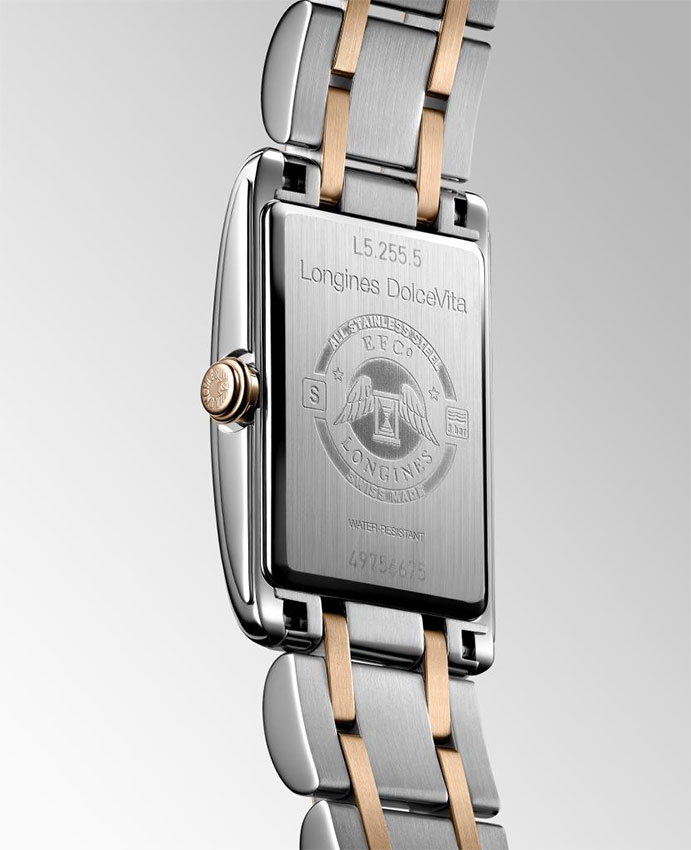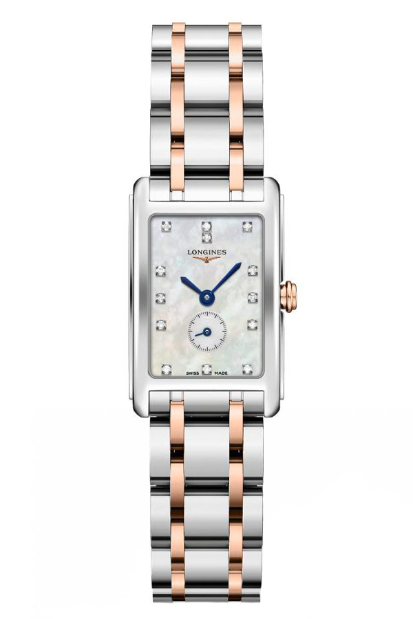 Elegantní, klasické, dámské hodinky Longines DolceVita. Stylové obdélníkové pouzdro vyrobené z nerezové oceli. Perleťový číselník osazený 13 diamanty Top Wesselton VVS na hodinových značkách. Na ciferník se díváme přes tvrdé safírové sklíčko, které nepoškrábe. Hodinky Longines DolceVita jsou vybaveny základním hodnocením voděodolnosti, které vám umožní mýt si ruce a stříkat vodu. Pohodlný náramek vyrobený z nerezové oceli s prvky z 18karátového růžového zlata.