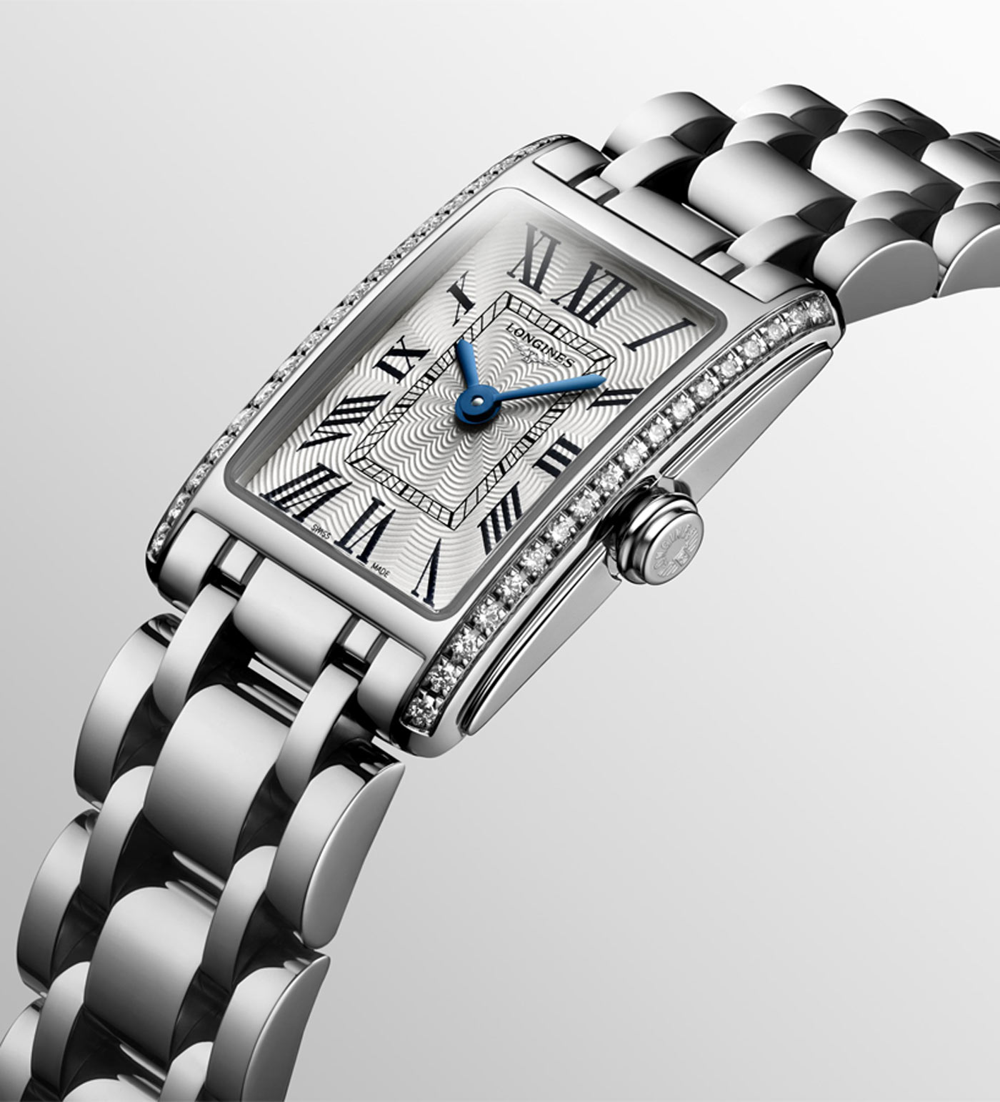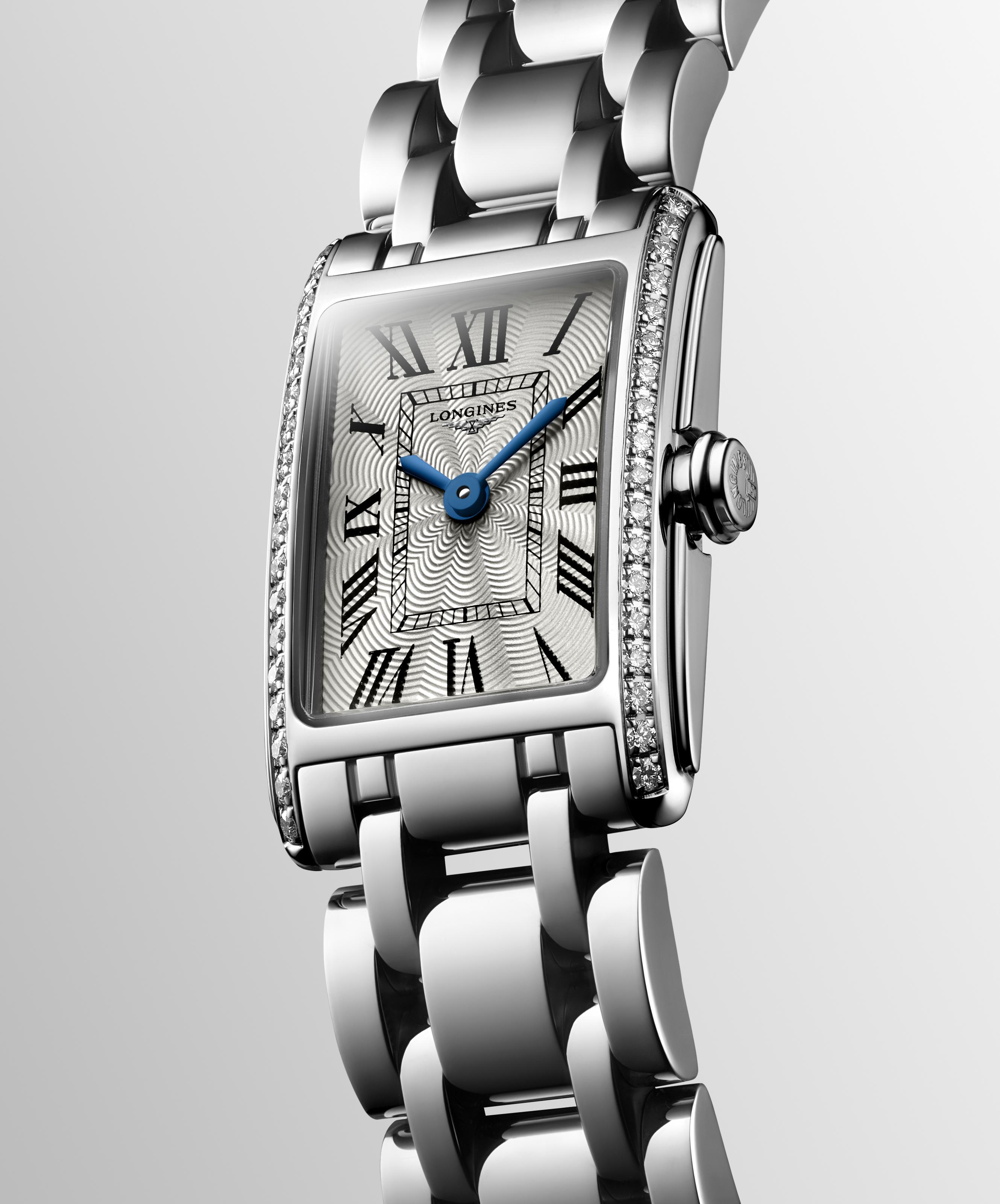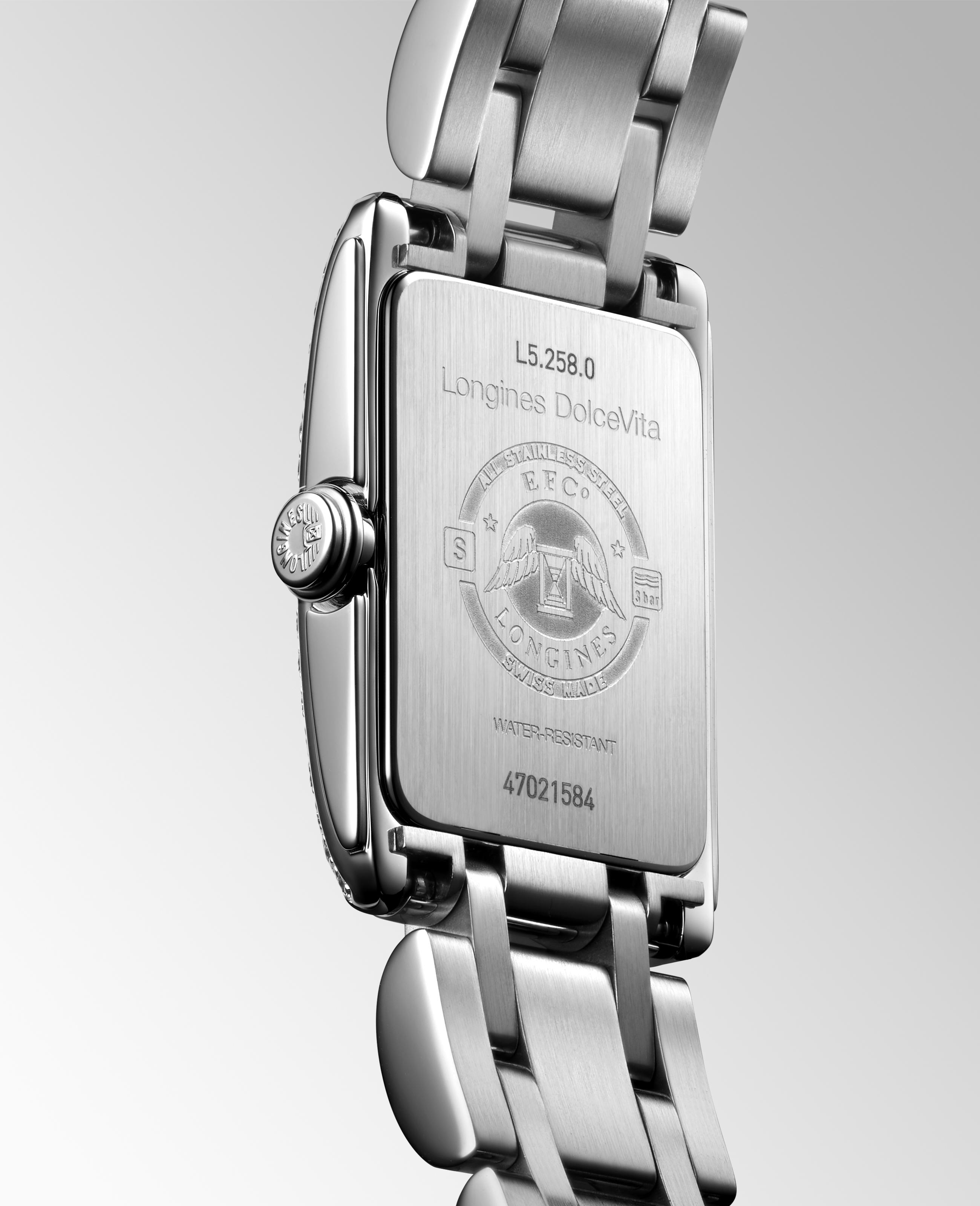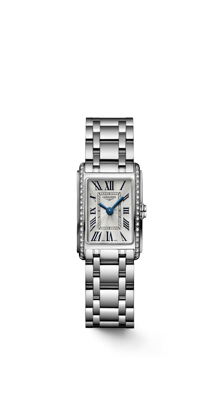 Dámské hodinky Longines z kolekce DolceVita jsou nadčasovou elegancí. Hodinky vyrobené z velmi módní, leštěné nerezové oceli odolné vůči korozi. Sklo je tvrdé, odolné proti poškrábání a křišťálově čisté. Uvnitř pouzdra najdeme švýcarský quartz Machineek napájený baterií. Hodinky zdobí 36 diamantů Top Wesselton VVS, (0,280 ct.), ciferník je dobře čitelný a označen římskými číslicemi. Celek se velmi hezky hodí jako elegantní doplněk moderního šatníku.