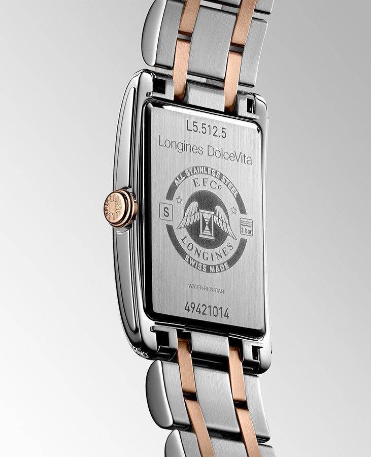 Dámské hodinky Longines DolceVita L5.512.5.79.7, ztělesňující dokonalou jednoduchost, rafinované linie Longines DolceVita z nich dělají objekt krásy v dokonalé formě. Tyto quartzové hodinky na baterie jsou módní a zároveň nenáročné. Je to klasika, která nikdy neztratí své kouzlo. Hodinky zaujmou svým vyváženým designem: dvě ručičky a vteřinová ručička nad polohou šestky jsou velmi dobře čitelné, zatímco nápadné plynulé linie pouzdra jim dodávají vznešený charakter. Hodinky Longines DolceVita jsou klenotem a elegantním zároveň. Prvky náramku jsou vyrobeny z 18karátového růžového zlata. Můžeme si být jisti, že hodinky zkrášlí zápěstí každé ženy, a to díky diamantům na pouzdru. Elegantní, obdélníkové pouzdro o rozměrech 23 x 37 mm padne každému zápěstí.