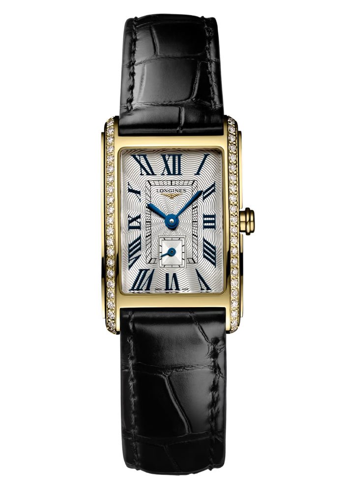 Zlaté dámské hodinky Longines DolceVita L5.255.7.71.0 se skládají z obdélníkového pouzdra o rozměrech 20,50 x 32,00 mm vyrobeného z 18K žlutého zlata . Pouzdro na přední straně je osázeno 46 pravými diamanty kvality Top Wesselton . Použití jedinečné interpretace modelu dává vyniknout svým jemným liniím. Na pravé straně je zlatá krajka zdobená logem Longines. Na rubu hodinek je zlaté pouzdro s mimo jiné okřídlenými přesýpacími hodinami symbolizujícími značku Longines. Obdélníkové dámské hodinky byly zkombinovány s měkkým a lehkým páskem z černé exotické kůže. Tento snadno oblékatelný řemínek jemně obepne zápěstí každé ženy a lze jej zapnout díky klasické přezce.