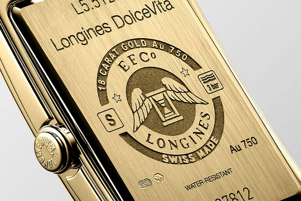 Dámské zlaté hodinky Longines DolceVita L5.512.6.71.0 se skládají z obdélníkového pouzdra o rozměrech 23,00 x 37,00 mm vyrobeného z 18K žlutého zlata . Použití jedinečné interpretace modelu dává vyniknout svým jemným liniím. Na pravé straně je zlatá krajka zdobená logem Longines. Na rubu hodinek je zlaté pouzdro s mimo jiné okřídlenými přesýpacími hodinami symbolizujícími značku Longines. Obdélníkové dámské hodinky byly zkombinovány s měkkým a lehkým páskem z černé exotické kůže. Tento snadno oblékatelný řemínek jemně obepne zápěstí každé ženy a lze jej zapnout díky klasické přezce.