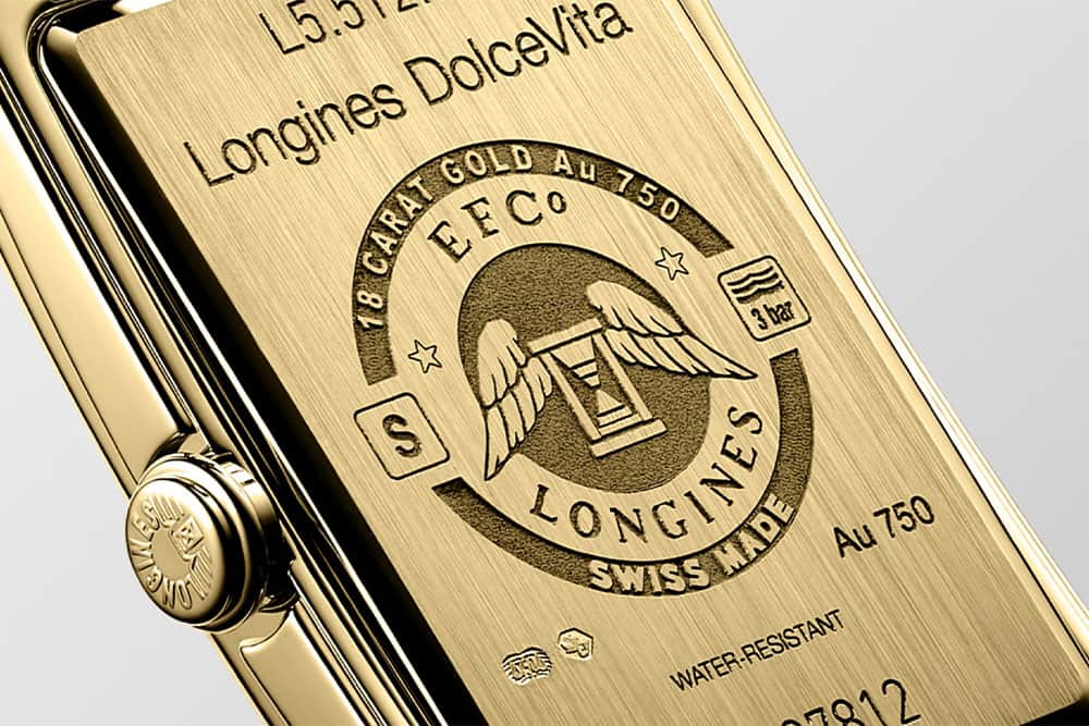 Dámské zlaté hodinky Longines DolceVita L5.512.7.71.0 se skládají z obdélníkového pouzdra o rozměrech 23,00 x 37,00 mm vyrobeného z 18K žlutého zlata . Pouzdro na přední straně je osázeno 46 pravými diamanty kvality Top Wesselton . Použití jedinečné interpretace modelu dává vyniknout svým jemným liniím. Na pravé straně je zlatá krajka zdobená logem Longines. Na rubu hodinek je zlaté pouzdro s mimo jiné okřídlenými přesýpacími hodinami symbolizujícími značku Longines. Obdélníkové dámské hodinky byly zkombinovány s měkkým a lehkým páskem z černé exotické kůže. Tento snadno oblékatelný řemínek jemně obepne zápěstí každé ženy a lze jej zapnout díky klasické přezce.