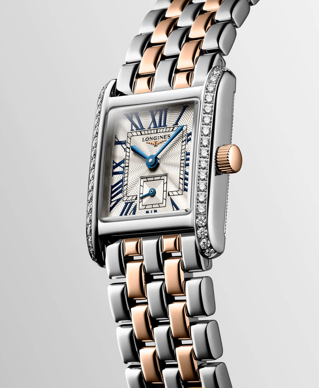 Vyrobené z vysoce kvalitní ušlechtilé oceli 316L, obdélníkové pouzdro o rozměrech 21.50 mm x 29 mm se vyznačuje dokonalými proporcemi a jemným leskem. Na pouzdře je umístěno 38 pravých diamantů Top Wesselton IF-VVS - 0.456 karátu, které oslnivým způsobem obohacují design tohoto luxusního časoměru. Na pravé straně je instalována korunka z 18karátového růžového zlata. Náramek je také sám o sobě krásný — jeho centrální články jsou obohaceny o vložku 200 ze růžového zlata, čímž vzniká harmonická kompozice s luxusním charakterem. Ocelový pásek se skládá z drobných článků, což zajišťuje dokonalé přizpůsobení zápěstí a poskytuje nejvyšší úroveň pohodlí při nošení. Bezpečné motýlkové zapínání garantuje spolehlivost a zároveň podtrhuje elegantní vzhled hodinek.