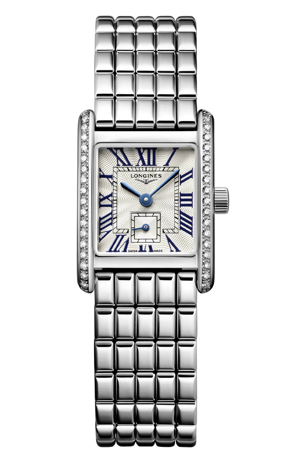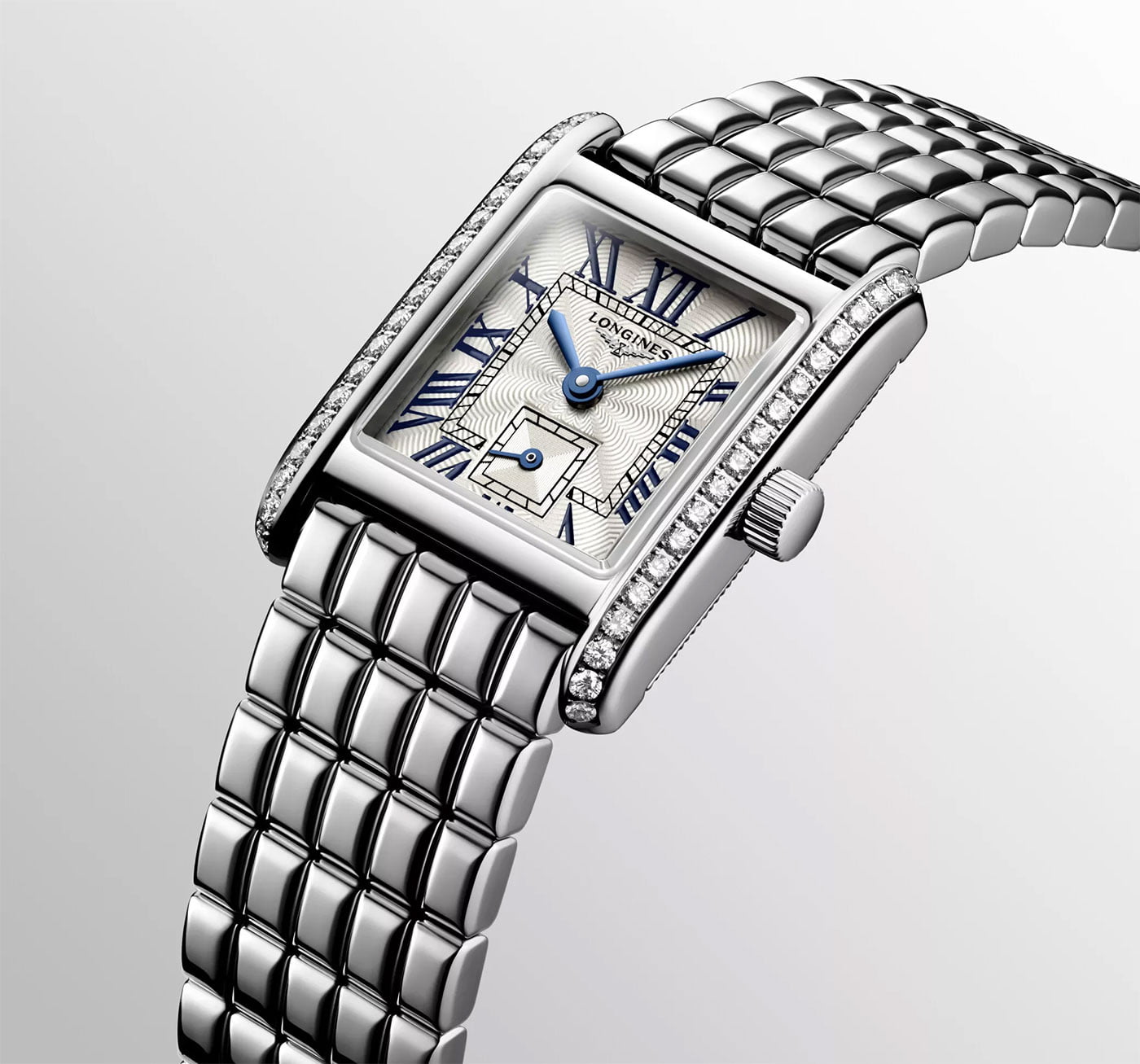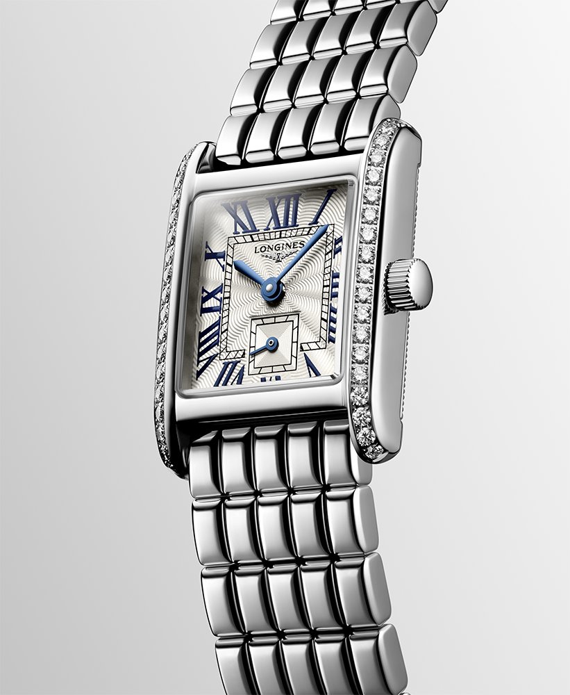 Výše uvedené malé dámské náramkové hodinky Longines DolceVita Mini se vyznačují římským ciferníkem inspirovaným stylem Art Deco 20. století. Zaujme svým nekompromisním gilošovaným povrchem s flinque vzorem. Na číselníku jsou také malované římské číslice a celý je zakončen modrými indikacemi z oxidované oceli. Malá vteřinová ručka je umístěna na 6. hodině a je uzavřena ve čtvercovém subciferníku. To vše pod prakticky zcela odolným proti poškrábání a dokonale průhledným safírovým sklíčkem.