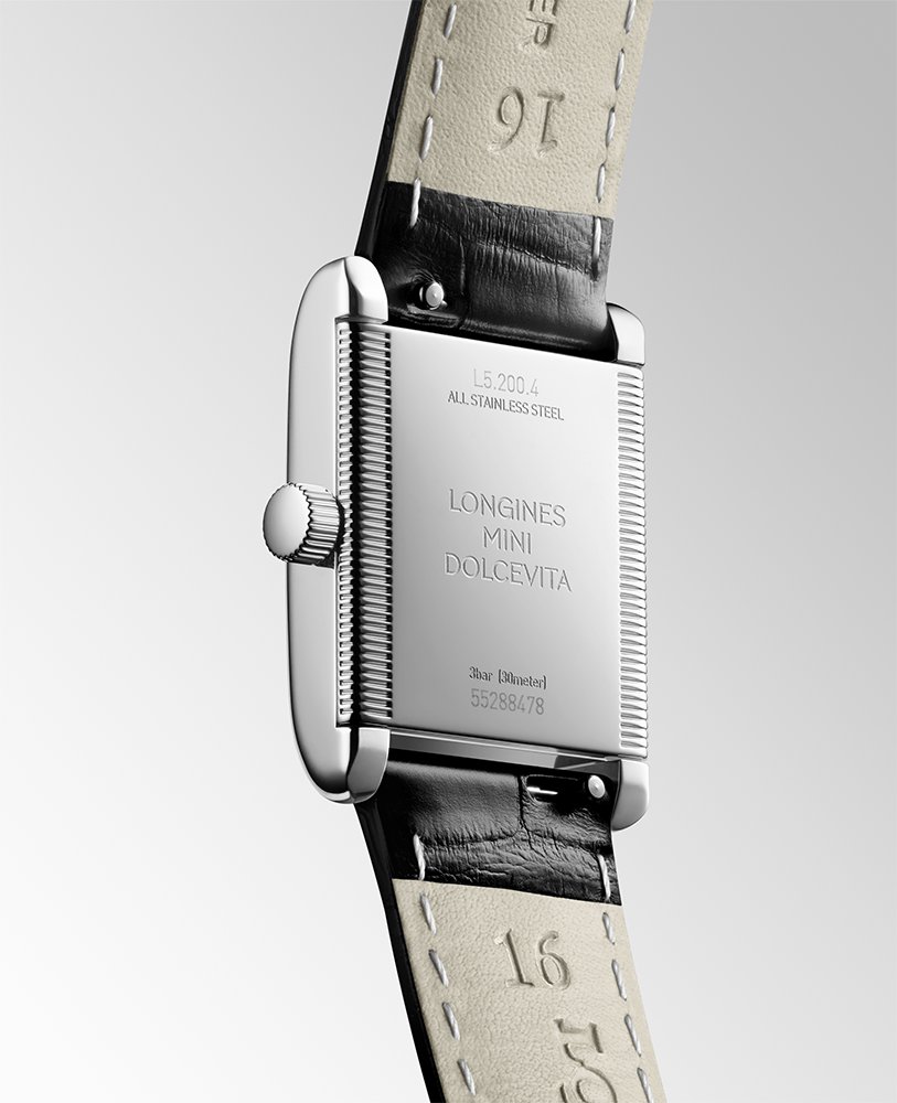 Pouzdro se vyznačuje zmenšeným profilem (21,50 mm x 29,00 mm) a čistými, měkkými liniemi. Uvnitř je vysoce přesný švýcarský quartzový mechanismus L178 s funkcí malých sekund. Černý řemínek z aligátoří kůže se zapíná na klasickou přezku. Inspirací pro celou sérii Mini DolceVita byly ikonické hodinky Longines z roku 1927 a původní kolekce DolceVita z roku 1997. S touto linií se zrodil dnes již známý slogan „Elegance je postoj“.