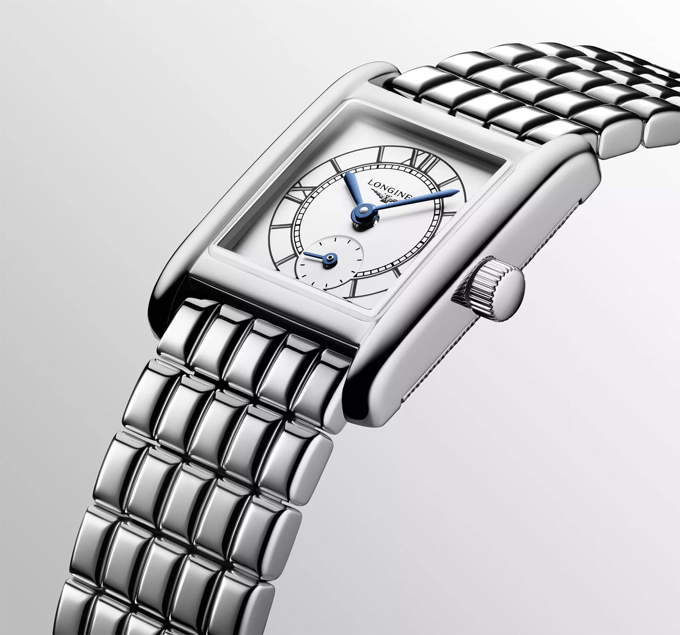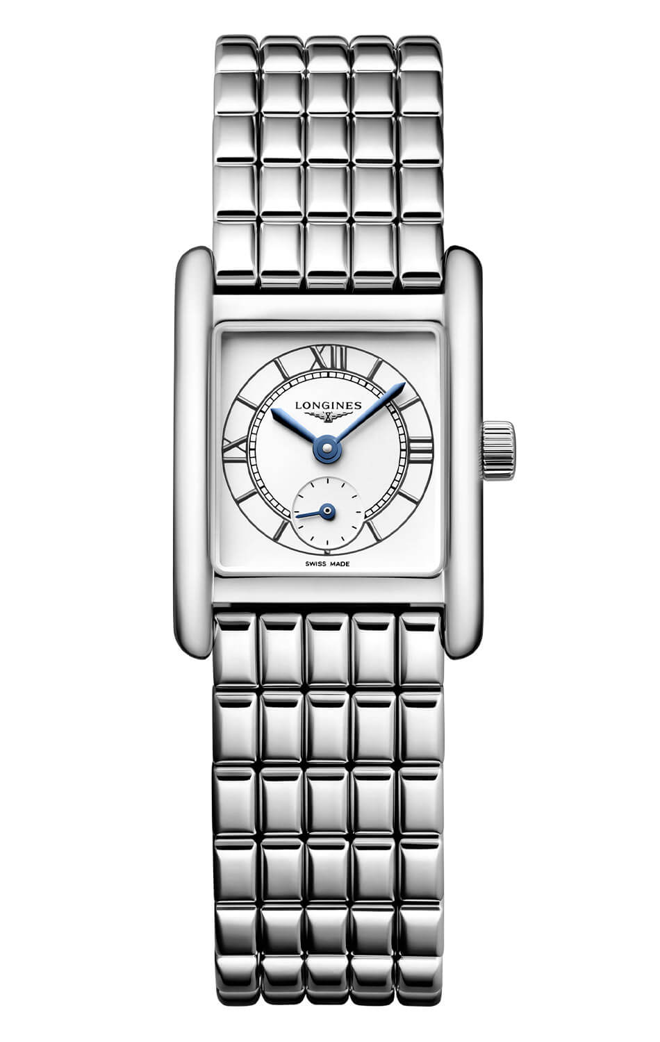 Výše uvedené jemné dámské náramkové hodinky Longines DolceVita Mini se vyznačují novým typem ciferníku Cosmo s pískovanou úpravou a kruhovým motivem uzavřeným v obdélníkovém tvaru. Ciferník Cosmo je nevtíravou hrou kontrastů mezi stříbřitým pozadím se slunečným výbrusem, bílou, matnou hodinovou stopou, stříbřitým vnitřním kruhem se slunečným výbrusem a bílým, matným, kulatým subciferníkem. Malované římské číslice a modré ručičky z oxidované oceli zajišťují vynikající čitelnost proti jemnějšímu tónu ciferníku. To vše pod prakticky zcela odolným proti poškrábání a dokonale průhledným safírovým sklíčkem.