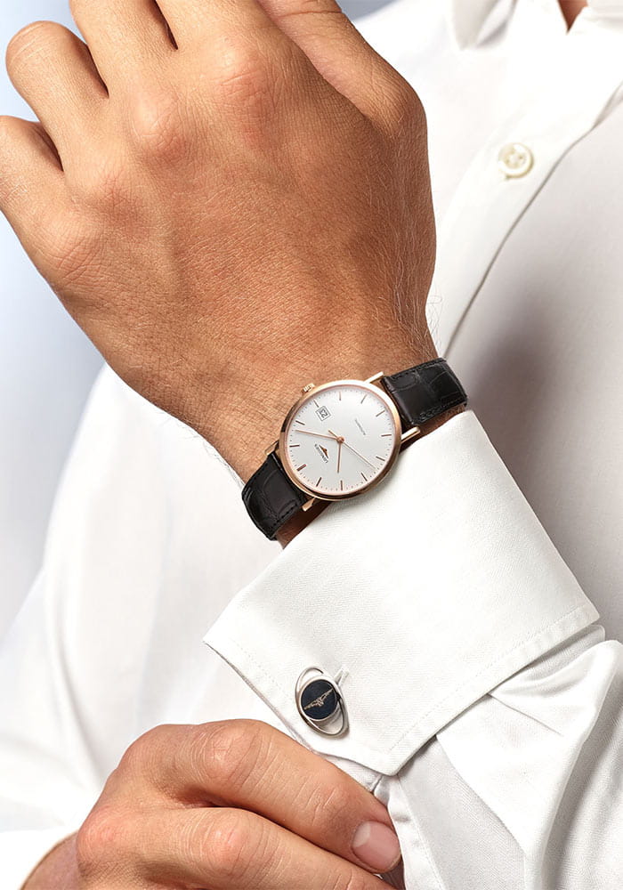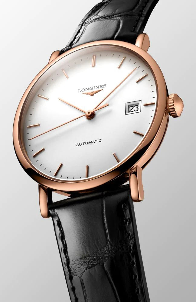 Pouzdro hodinek je vyrobeno z 18k růžového zlata o průměru 37 mm a bylo zapečetěno až na 30 metrů. Na bílém matném ciferníku jsou indexy a datumové okénko s aktuálním dnem v měsíci na třetí pozici. Celý je chráněn safírovým sklem vysoce odolným proti poškrábání a poškození. Uvnitř pouzdra je automatický Machineek kalibr L888, který zaručuje přesné měření času a rezervu chodu až 72 hodin. Na zadní straně pouzdra je skleněné pouzdro chráněné safírovým sklem, díky kterému můžete obdivovat práci mechanismu. Hodinky Longines Elegant Automatic jsou spárovány s exotickým černým páskem. Pohodlí a bezpečnost zajistí motýlková spona.