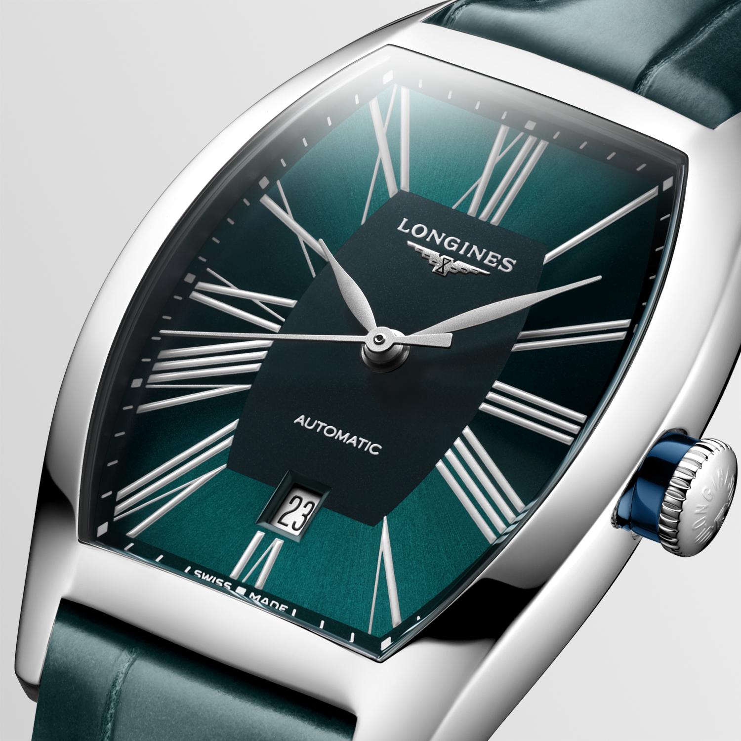 Dámské hodinky Longines Evidenza L2.142.4.60.2 jsou věrnou reprezentací výše zmíněného stylu, tehdy vnímaného jako nával moderny a dnes jako atraktivní přehlídka úžasné retro konvence. Prezentovaný automatický model zachycuje eleganci 20. století s avantgardním soudkovitým pouzdrem, abstraktně zakřivenou římskou hodinovou stupnicí, třpytivým sytě tyrkysovým číselníkem chráněným antireflexním safírovým sklem a exkluzivním páskem z exotické kůže aligátora v číselníku. odstín.