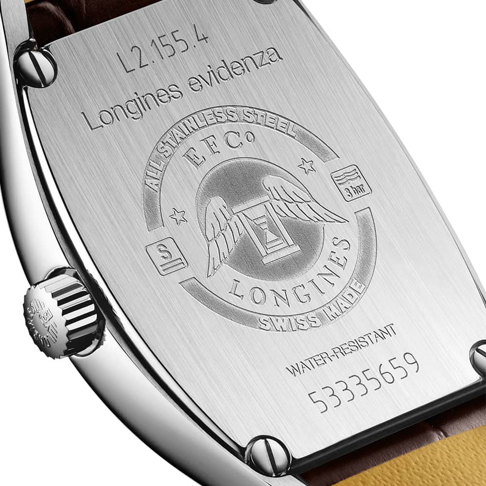 Dámské hodinky Longines Evidenza L2.155.4.71.5 jsou sudovité ocelové pouzdro o rozměrech 26,00 mm x 30,60 mm, které je utěsněno na 30 metrů . Pod safírovým sklíčkem, které se extrémně těžko poškrábe, se nachází stříbrný ciferník. Aktuální čas naznačují elegantní stříbrné ručičky. Ciferník se vyznačuje především estetikou, ale také klasickým designem. V 6 hodin je datumové okno, které ukazuje aktuální den v měsíci. Na očka hodinek je připevněn elegantní řemínek z exotické hnědé kůže. Řemínek má bezpečnou motýlkovou sponu se 2 knoflíky. Pod ciferníkem je švýcarský quartzový Machineek kalibr L152 s funkcí End of Life. Funkce EoL vás bude informovat o nutnosti výměny baterie, když ukazatel každých pár sekund začne přeskakovat body.