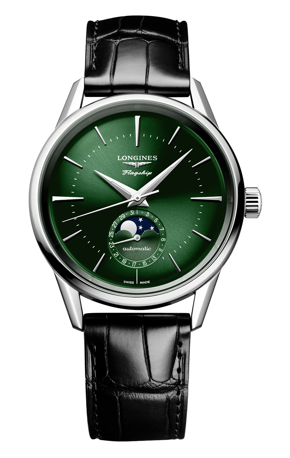Elegantní pánské hodinky Longines Flagship Heritage Moonphase L4.815.4.02.2 jsou dalším modelem inspirovaným klasickými modely z 50. let 20. století, který vzdává hold této legendární linii. Ciferník hodinek Longines Flagship Automatic, jemně vypouklý a vynikající unikátním odstínem zelené, je zdobený jemným slunečním leštěním, které zdůrazňuje harmonii mezi tradicí a moderní řemeslnou precizností. Ručně aplikované hodinové indexy, prodloužené pro 3., 9. a 12. hodinu, dodávají ciferníku rafinovaný charakter. Hodinové indexy i ručičky jsou rhodiované, přičemž ručičky jsou navíc pokryté luminescenční vrstvou Super-LumiNova®, která zajišťuje viditelnost i za šera. Elegantní barevná kombinace se zde spojuje s jemným indikátorem fáze měsíce, který překvapuje precizností zpracování.