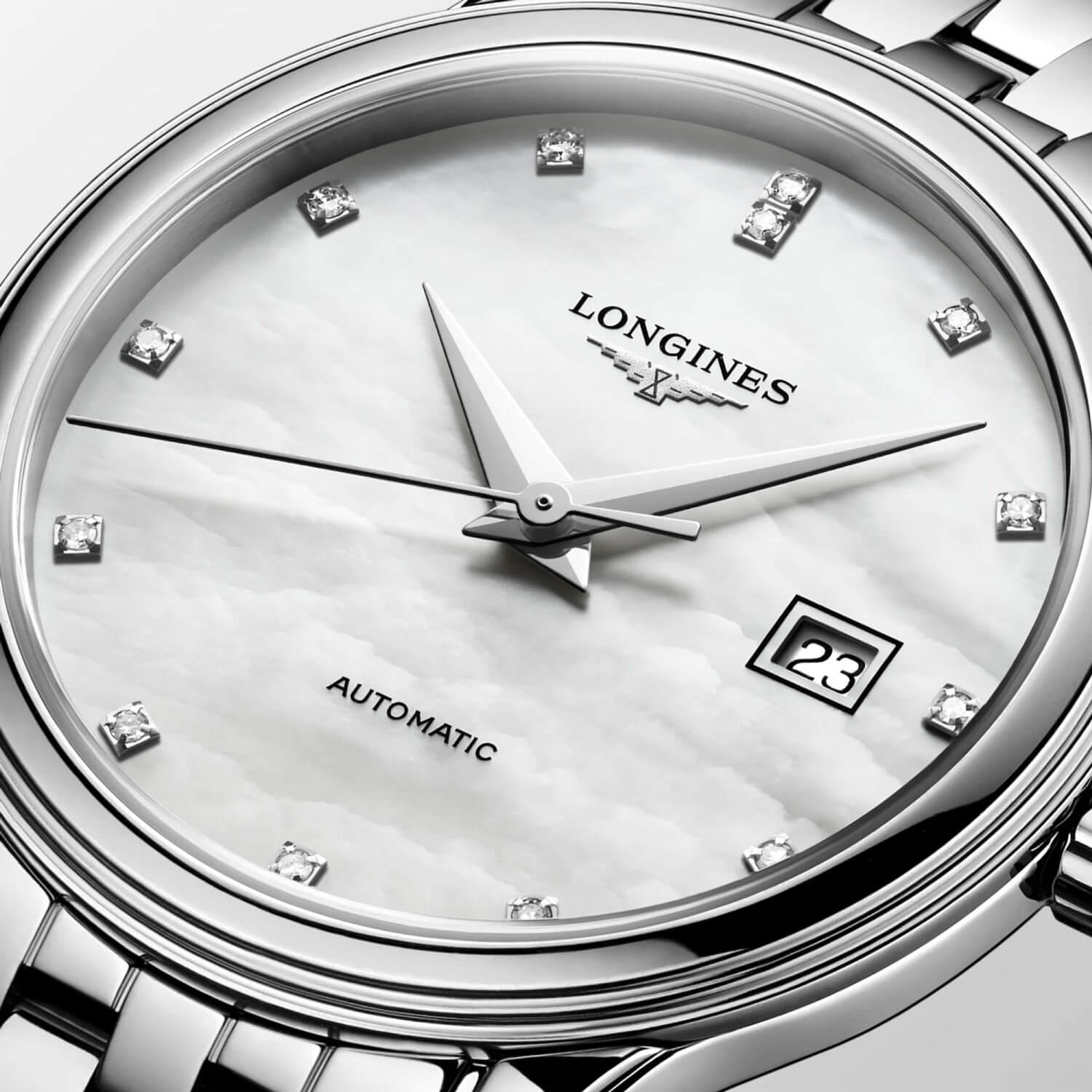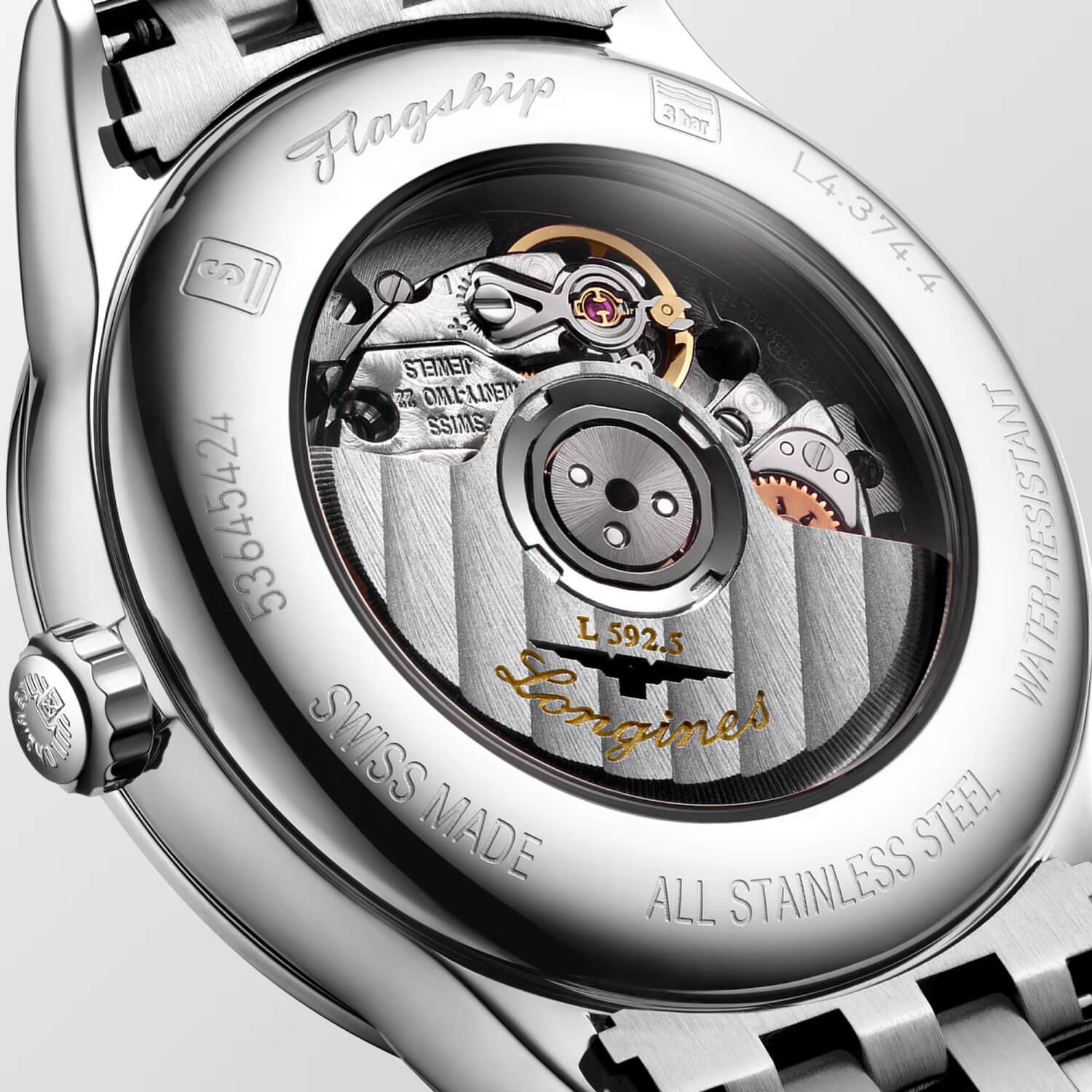 Pod štíhlým pouzdrem o průměru 30 mm pracuje automatický strojek Longines kalibr L592 s vysokou frekvencí 28 800 kyvů za hodinu. Jeho klíčovým prvkem je setrvačková pružina z monokrystalického křemíku – materiálu odolného vůči magnetickým polím a teplotním výkyvům. Díky tomu je strojek stabilní a přesný a nabízí rezervu chodu až 45 hodin. Z přední strany je hodinky chrání safírové sklíčko s antireflexní vrstvou, zezadu pak průhledné dýnko umožňující obdivovat rotor a pohyb jednotlivých součástek.