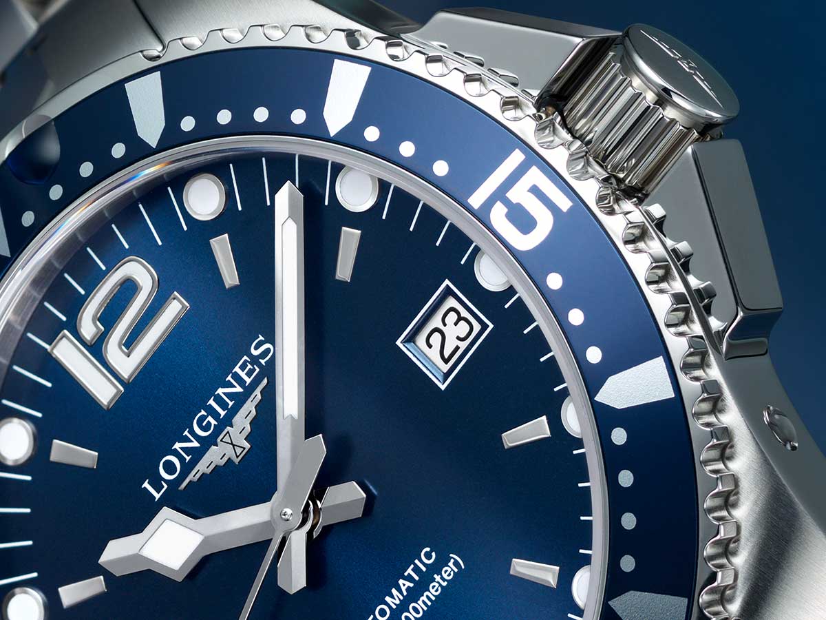 Představený model z exkluzivní kolekce HYDROCONQUEST svým vzhledem a interiérem silně vysvětluje svůj název. Hodinky v nepochybně diverském stylu s jasnou sytou barvou ciferníku v modrém odstínu (sunburst) se stříbrnými ručičkami a ukazateli hodin a malým červeným hrotem vteřinové ručky. Tyto prvky jsou pokryty luminiscenční látkou , která je ve dne exponovaná díky své svítivě zelené barvě dokonale zvýrazní v pozdních večerních hodinách a dokonce i v noci. Hodinky díky tomu splní svůj primární úkol udávat čas i ve tmě podmořských hlubin při diverských výpravách. Aby to bylo fyzicky možné, hodinky se vyznačují vysokou třídou vodotěsnosti až do 300 metrů . Tato působivá hodnota je nutností pro potápění se zárukou, že vnitřní mechanismus citlivý na vodu zůstane neporušený. K tomu přispívá i šroubovaná korunka a záda pouzdra , které dále zvyšují odolnost a odolnost hodinek v náročných podmínkách. To vše proto, aby jeho uživatel měl možnost naplno si užít své oblíbené aktivity – bez ohledu na jejich extrémní míru. Mezi další funkce na analogovém číselníku patří zobrazení data na 3 hodinách. Celý ciferník kryje nejkvalitnější safírové sklo s antireflexem, vynikající díky jeho hlavním přednostem, kterými jsou vysoká odolnost proti poškrábání a křišťálová čistota. Významnou funkčností a zároveň přidáním sportovního temperamentu je otočná keramická luneta sloužící jako doplňková minutová stupnice . Pouzdro s prodlouženým náramkem (ideální řešení pro divere, kterým přítomnost obleku zvětšuje zápěstí) jsou vyrobena z nerezové oceli , která díky svým jedinečným vlastnostem nachází uplatnění při ochraně proti korozi. Zachová texturu povrchu bez škrábanců po dlouhou dobu a také ve stříbrném lesku, chrání lesklé prvky před zmatněním.