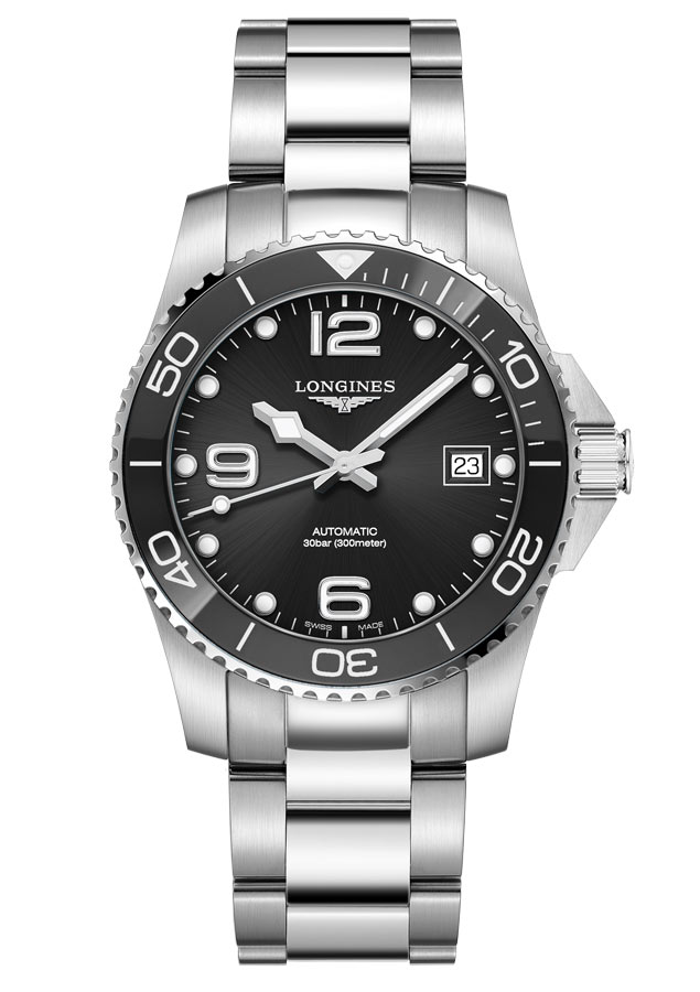 Diverské hodinky Longines HydroConquest Automatic L3.780.4.56.6 s průměrem pouzdra 39 mm . Model se vyznačuje odvážným a jedinečným designem. Cílí především na aktivní lidi, kteří sportují a mají malá nebo hubená zápěstí. Hodinky mohou být ideální nabídkou nejen pro muže, ale i pro ženy, které hledají výrazné sportovní hodinky. HydroConquest má všechny profesionální funkce, které by diverské hodinky měly mít. Vysoká třída voděodolnosti až 30 bar / 300 m , otočná luneta s diverskou stupnicí z černé keramiky, šroubovací korunka a zadní pouzdro, skládací spona s dvojitým zabezpečením s integrovaným diverským nástavcem, vícevrstvé safírové sklo, které odráží odlesky a zajišťuje bezchybné čitelnost pod vodou. Na černém ciferníku jsou tečky a arabské indexy, které jsou stejně jako ručičky vyplněny luminiscenční hmotou.