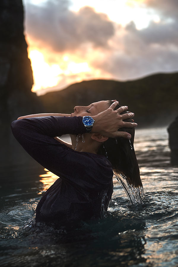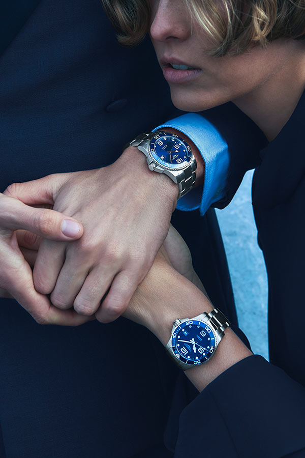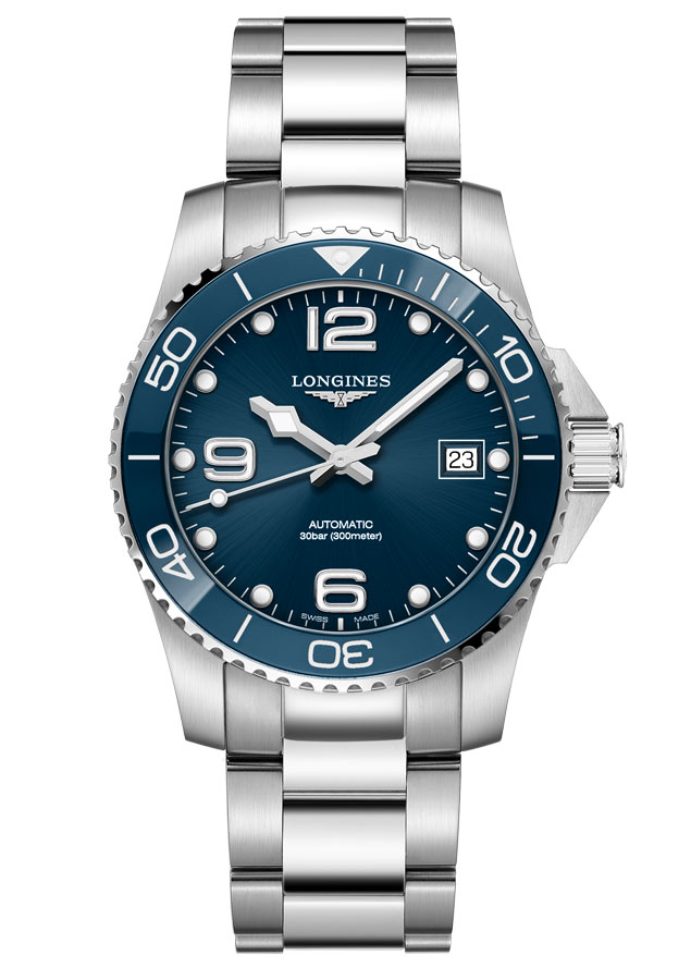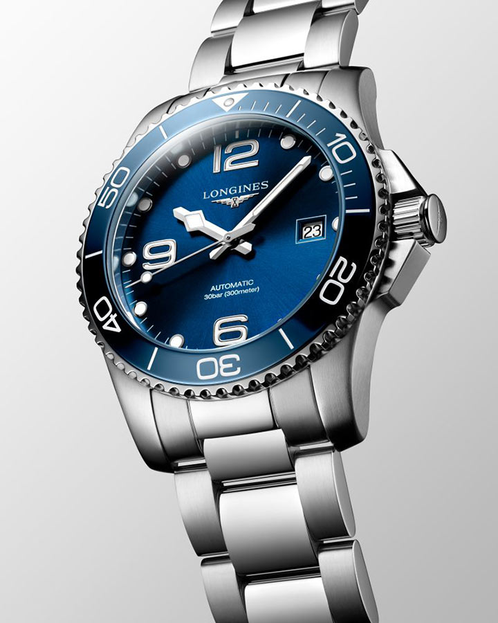 Diverské hodinky Longines HydroConquest Automatic L3.780.4.96.6 s průměrem pouzdra 39 mm . Model se vyznačuje odvážným a jedinečným designem. Cílí především na aktivní lidi, kteří sportují a mají malá nebo hubená zápěstí. Hodinky mohou být ideální nabídkou nejen pro muže, ale i pro ženy, které hledají výrazné sportovní hodinky. HydroConquest má všechny profesionální funkce, které by diverské hodinky měly mít. Vysoká třída voděodolnosti až 30 bar / 300 m , modrá keramická otočná luneta s diverskou stupnicí, šroubovací korunka a zadní část pouzdra, dvojitá bezpečnostní skládací spona s integrovaným diverským nástavcem, safírové sklo s více vrstvami, které odráží odlesky a zajišťuje bezchybnou čitelnost pod vodou . Na modrém ciferníku jsou tečka a arabské indexy, které jsou stejně jako ručičky vyplněny luminiscenční hmotou.