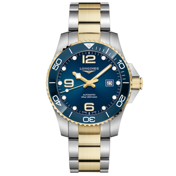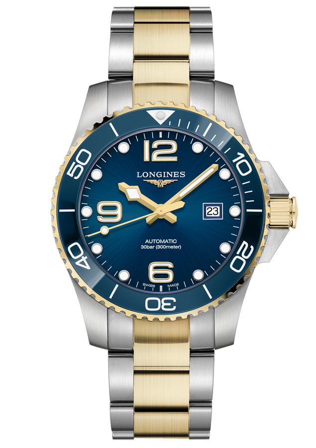 Diverské hodinky Longines HydroConquest Automatic L3.782.3.96.7 ve verzi o průměru pouzdra 43 mm . Model se vyznačuje odvážným a jedinečným designem. Cílí především na aktivní lidi, kteří sportují. Hodinky mohou být ideální nabídkou pro muže, kteří hledají výrazné sportovní hodinky. HydroConquest má všechny profesionální funkce, které by diverské hodinky měly mít. Vysoká třída voděodolnosti do 30 bar / 300 m, otočná luneta s diverskou stupnicí z modré keramiky zdobená zlatem, šroubovací korunka a zadní pouzdro, ocelový náramek s diverským nástavcem, safírové sklíčko s více vrstvami odrážejícími odlesky a zajišťuje bezchybnou čitelnost pod vodou. Na modrém ciferníku jsou tečka a arabské indexy, které jsou stejně jako ručičky vyplněny luminiscenční hmotou.