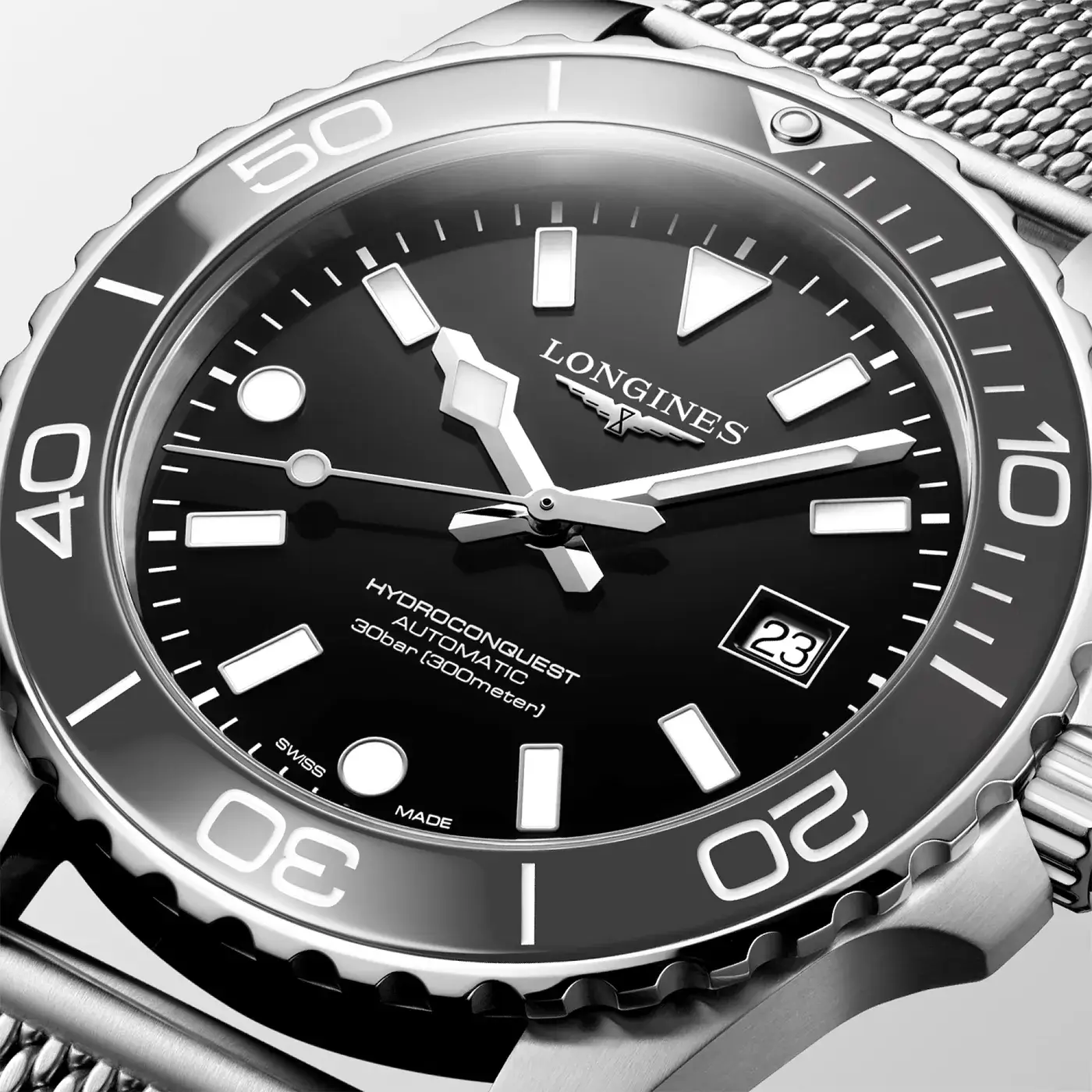 Automatické pánské potápěčské hodinky Longines HydroConquest Automatic L3.788.4.70.6 kombinují výraznou šedou keramickou lunetu s hlubokou černí lakovaného ciferníku a ocelovým náramkem typu mesh, který se v této verzi kolekce HydroConquest objevuje vůbec poprvé. Právě tento prvek zdůrazňuje novou generaci modelu, v níž se dobrodružství setkává s elegancí a sportovní funkčnost získává vytříbenější charakter. Taková volba barev a materiálů dodává hodinkám moderní a dynamický vzhled, zatímco použití leštěné keramiky na lunetě zajišťuje, že nejvíce exponovaná část pouzdra zůstává odolná vůči poškrábání a po dlouhá léta si zachovává sytou barvu i zrcadlový lesk.