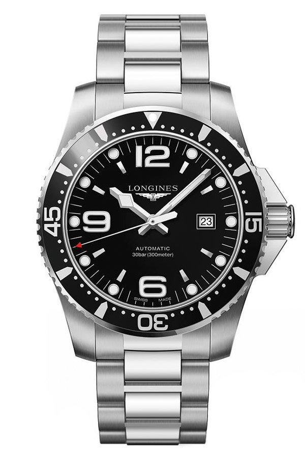 Hodinky Longines HydroConquest Automatic L3.841.4.56.6 - 44mm . Longines HydroConquest Automatic jsou profesionální diverské hodinky. Pouzdro je vyrobeno z nerezové oceli, která je odolná vůči korozi. Otočná luneta v černé barvě, stejně jako ručičky a indexy, jsou velmi přehledné, což je při potápění velmi důležité. Luminiscenční látka ve tmě velmi silně svítí. Hodinky mají šroubovací pouzdro a korunku, které je utěsní až do 30 barů. Tyto jedinečné hodinky spojují nadčasové kouzlo s nejnovější technologií. Výkon a elegance. Náramek se pohodlně nosí a má zacvakávací zámek s dodatečným zabezpečením a možností rychlého rozšíření na diverský oblek.