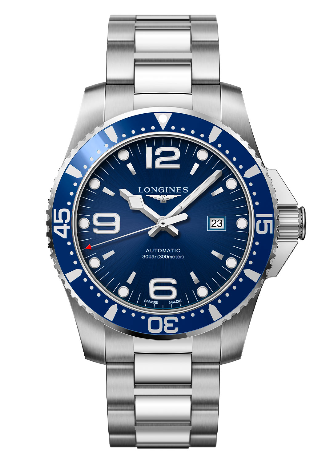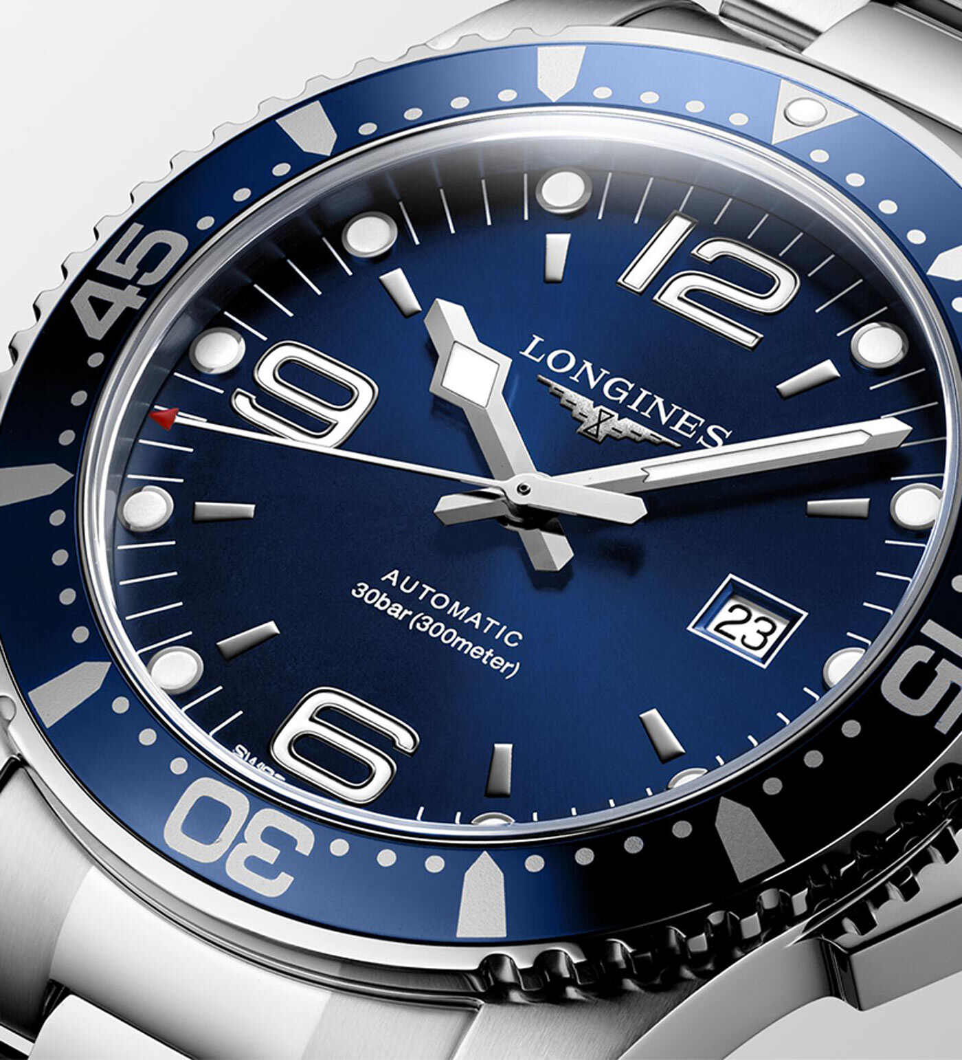 Dalším prvkem potápěčského chronometru Longines je safírové sklíčko s antireflexní vrstvou na obou stranách. Sklo vysoce odolné proti poškrábání kryje modrý ciferník s velkými, dobře čitelnými ručičkami a indexy. Díky antireflexní úpravě je číselník lépe čitelný. Ve tři hodiny je datumové okno s aktuálním dnem v měsíci. Když není světlo, lze aktuální čas odečítat pomocí luminiscenční hmoty Swiss Super-LumiNova ®, která je umístěna na ručičkách, indexech a na otočné lunetě na 12. hodině.