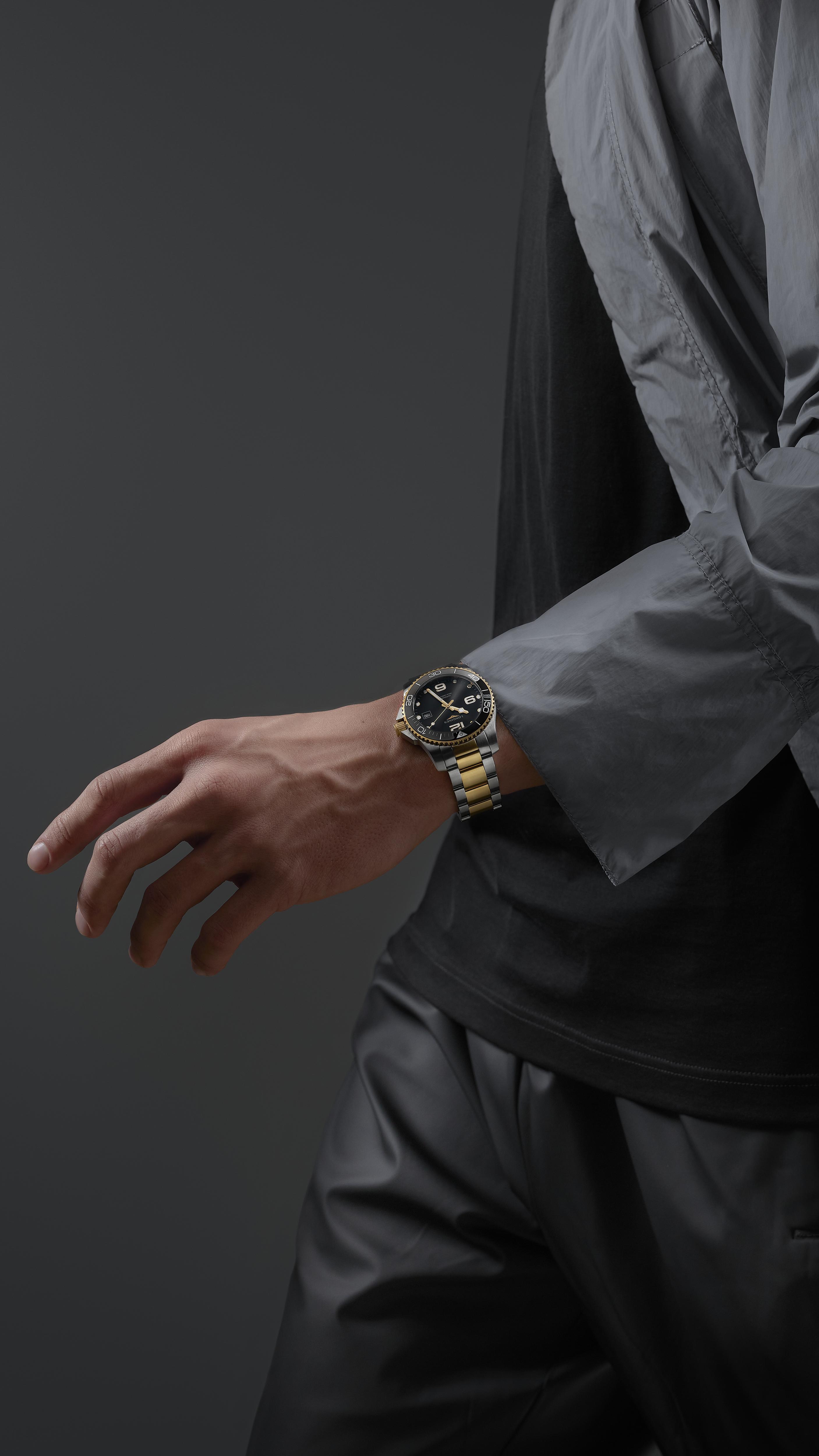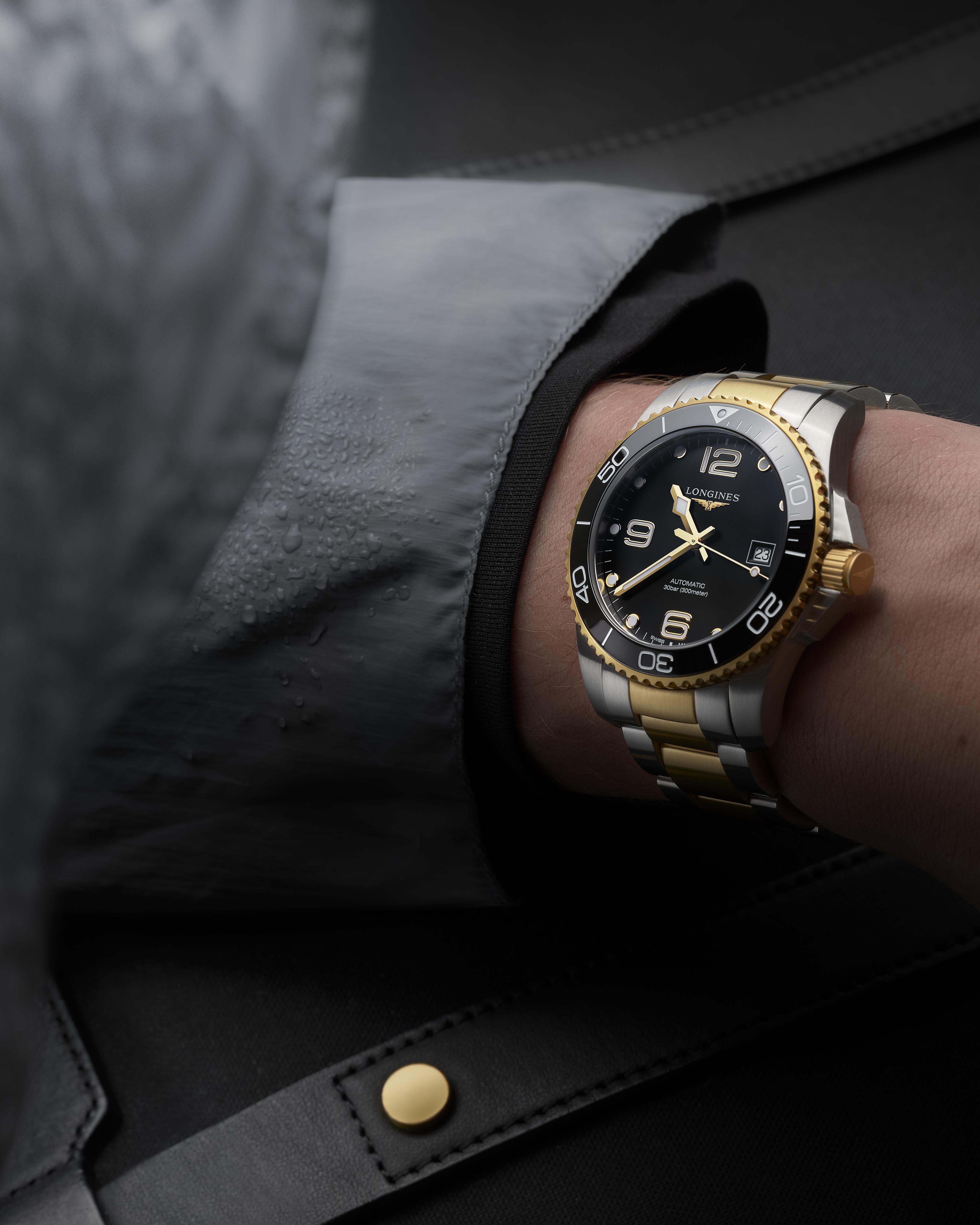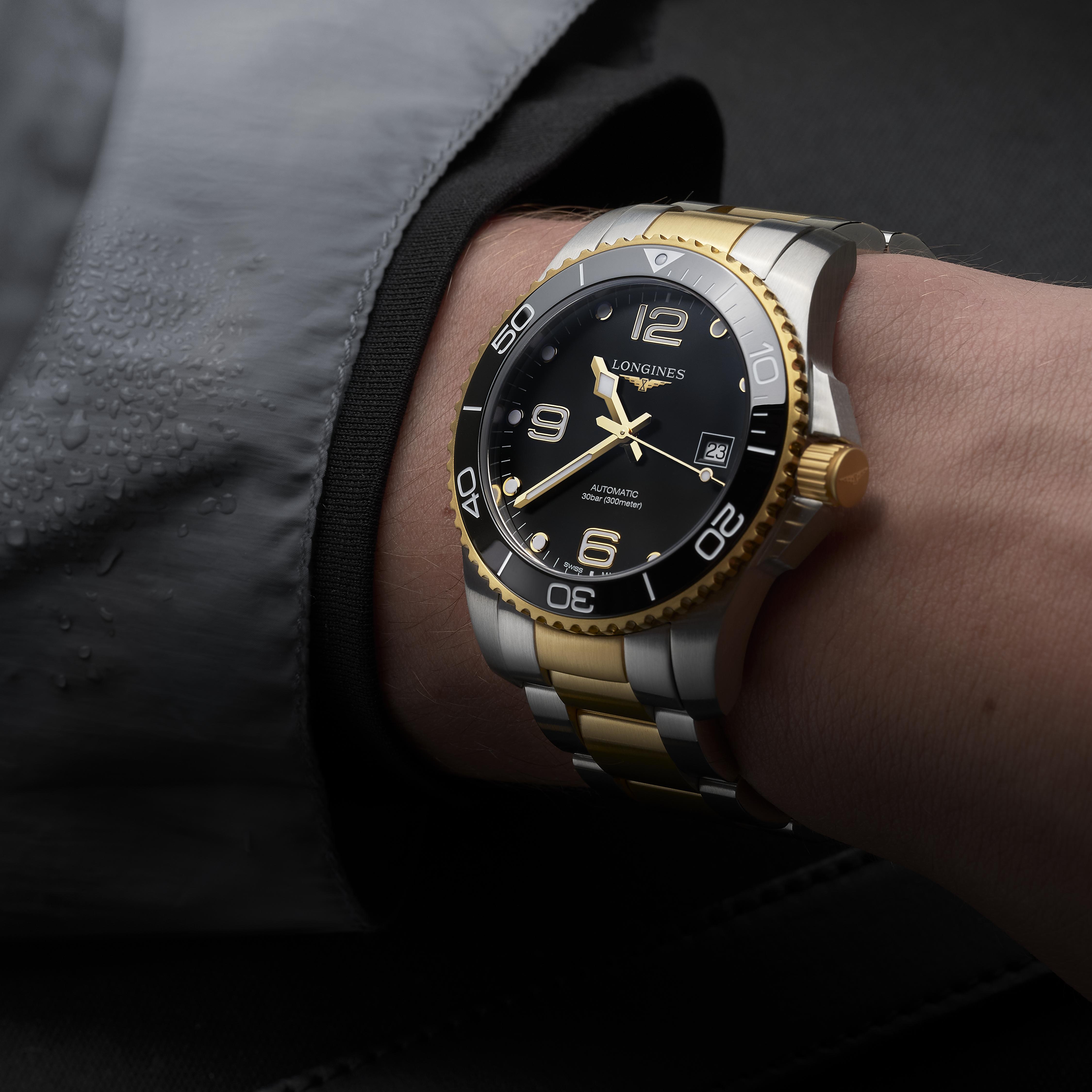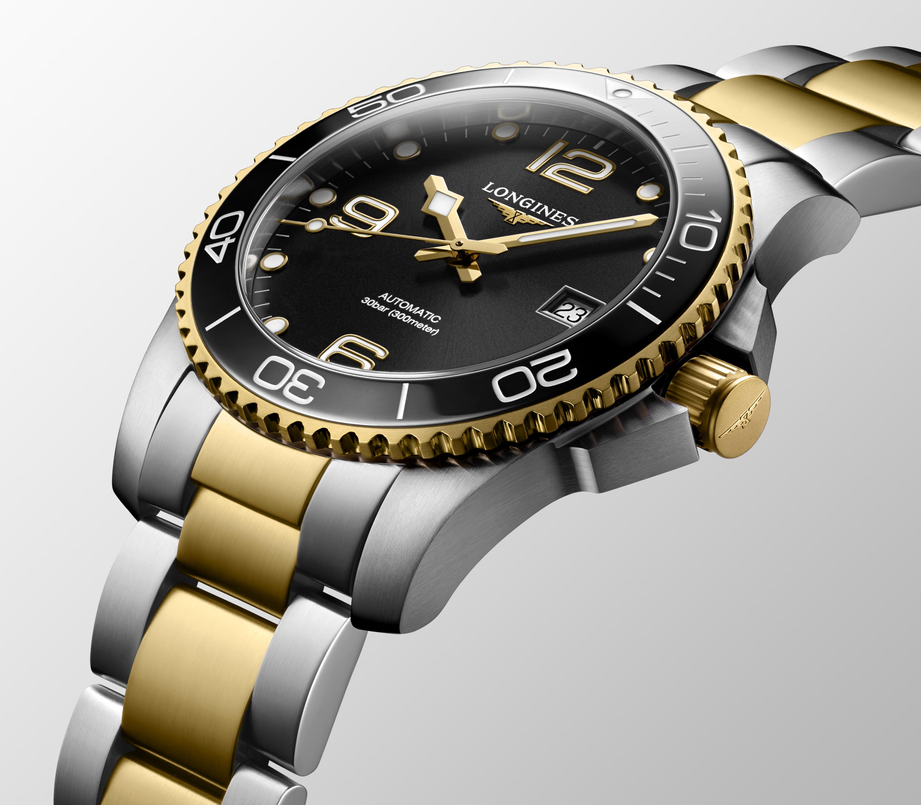 Longines HydroConquest L3.781.3.56.7 jsou hodinky, které úspěšně splní a dokonce předčí očekávání jak milovníků městského, tak i podvodního průzkumu. Estetický a vysoce luxusní design, který je kombinací broušené oceli, vrstvy žlutého PVD zlata a třpytivě černého ciferníku, dokonale zapadne do preferencí mužů, kteří mají rádi nevšední sportovní doplňky. Velké, arabské nebo bodové značky hodin a originální design ručiček (obě komponenty potažené Swiss Super-LumiNova®), otočná diverská luneta vyrobená z elegantní keramiky odolné proti poškrábání, stejně jako vysoká voděodolnost, která umožňuje potápění s hodinkami až do hloubky 300 m si poradí s požadavky mužů, kteří cítí potřebu prozkoumávat a/nebo prozkoumávat podmořský svět.