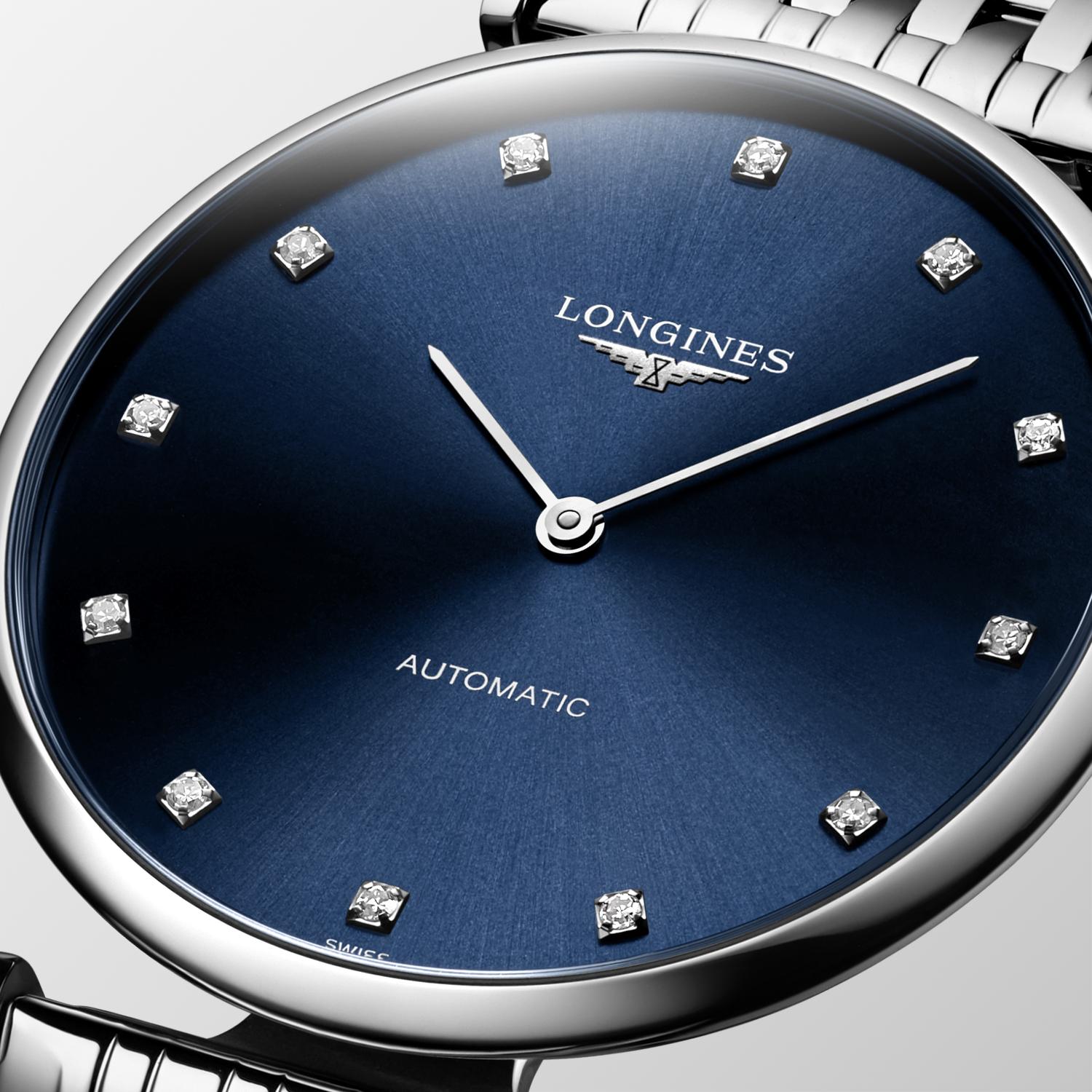 Modely La Grande Classique de Longines sehrály klíčovou roli při budování pověsti značky okřídlených přesýpacích hodin. Jejich ciferníky a řemínky dnes zdobí tmavě modrý odstín charakteristický pro švýcarského hodináře. Řada, která je symbolem klasické elegance, byla uvedena na trh v roce 1992 společností Longines a za ta léta zaznamenala mnoho zajímavých variací Originního stylu. Tento 36mm model má tmavě modrý ciferník sunburst a je vybaven náramkem. Uvnitř hodinek je automatický Machineek.