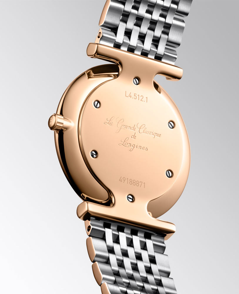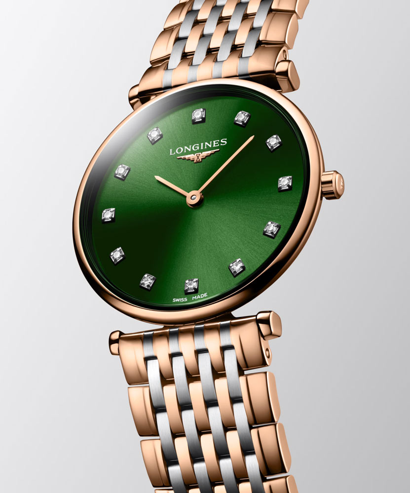 Hodinky Longines La Grande Classique jsou vyrobeny z vysoce odolné a odolné nerezové oceli, která je pokryta tvrdým růžovým zlatem PVD povlakem. Typografie se skládá z 12 pravých diamantů Top Wesselton a minimalistických označení. Celé je to spolu s logem švýcarského výrobce umístěno na třpytivém lahvově zeleném ciferníku chráněném nepoškrábavým a křišťálově čistým safírovým sklem.