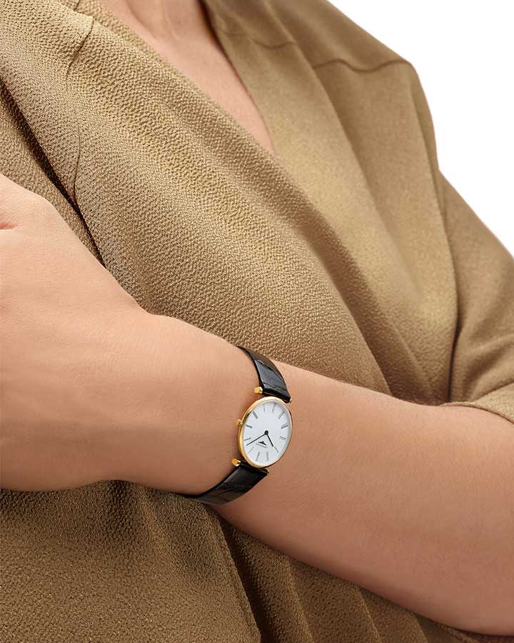 Kolekce Longines La Grande Classique byla poprvé uvedena na trh v roce 1992 a od té doby je pilířem značky. Od samého počátku představuje autenticitu, nadčasový styl a elegantní klasiku. Kultovní 29mm pouzdro, jehož hřbet tvoří také očka exkluzivního černého koženého řemínku z aligátora. Longines L4.512.2.11.2 je vyroben z vysoce odolné a odolné nerezové oceli, která je potažena tvrdým žlutým zlatem PVD povlakem. Logotyp okřídlených přesýpacích hodin švýcarského výrobce je umístěn na bílém ciferníku, který je chráněn nepoškrábatelným a křišťálově čistým safírovým sklem.