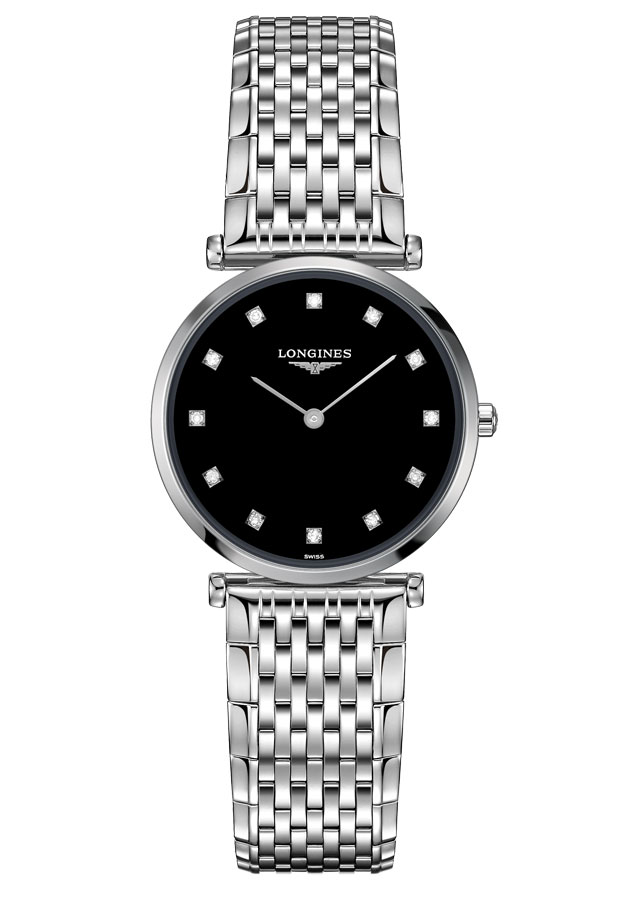 Hodinky Longines La Grande Classique L4.512.4.58.6 jsou vyrobeny z vysoce odolné a odolné nerezové oceli. Typografie se skládá z 12 přírodních diamantů Top Wesselton a minimalistických černých indicií. Celé je to spolu s logotypem švýcarského výrobce umístěno na černém ciferníku, který je chráněn nepoškrábatelným a křišťálově čistým safírovým sklem.