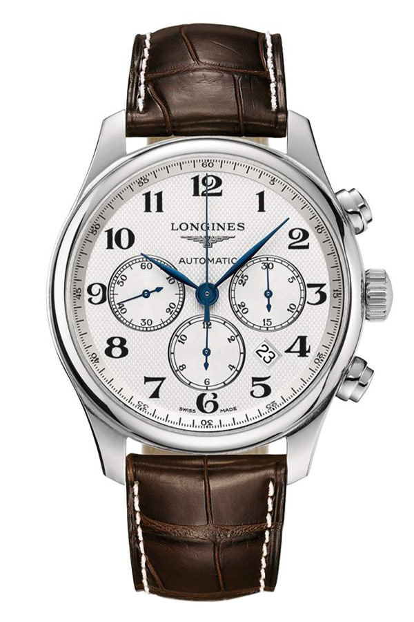 Nejkrásnějším prvkem těchto hodinek je stříbrný ciferník zdobený vzorem Clous De Paris a arabskými indexy. Úhledné modré ručičky jsou zodpovědné nejen za ukazování času, ale také za měření chronografu a stopek. Lehce vypouklé safírové sklíčko odolné proti poškrábání a vyhlazené hrany pouzdra dodávají eleganci. Exkluzivní řemínek z pravého aligátora s motýlkovou sponou je hnědé barvy. Skleněná záda pouzdra nám umožňují nahlédnout do krásně zpracovaného automatického Machineku ETA A08.L01 s funkcí chronografu. Machineek obsahuje sloupové kolo, které ztělesňuje odborné znalosti společnosti Longines v oblasti mechanického časování. Reaguje na očekávání zákazníků fascinovaných tradičními hodinářskými řešeními. Výrobní proces je složitý, protože kolo sloupku musí být vyrobeno dokonale, aby byla zajištěna spolehlivost a přesnost mechanismu. Extrémně snadno použitelné stopky: funkce start, stop a reset vyžadují pouze lehký dotyk. 54hodinová rezerva chodu tohoto kalibru je větší než průměrná rezerva chodu vačkových chronografů. Obvykle kolo vyrobené z modře zbarvené oceli.