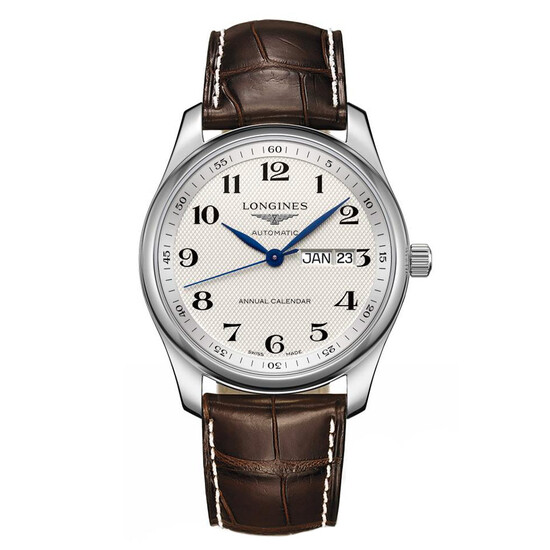 Výroční kalendář Longines Master Collection L2.910.4.78.3 , který kombinuje klasickou eleganci a technickou dokonalost, s plným kalendářem obsahuje nový automatický kalibr L897 ETA A31.L81 umístěný ve 40mm pouzdru z nerezové oceli. Přes prosklená záda lze obdivovat Machineek s rezervou chodu 64 hodin a plným kalendářem ve 3 hodiny. Roční kalendář Longines Master Collection obsahuje roční kalendář, který automaticky upravuje datum pro měsíce s 30 a 31 dny (tato operace probíhá mezi 24:00 a 5:00). Nezahrnuje však skok únorového data, a proto se musí jednou ročně upravit ručně. Ocelové modře zbarvené ručičky vynikají na stříbřitém ciferníku s potiskem ječného ucha. Elegantní hodinky doplňuje hnědý řemínek z aligátoří kůže s bezpečnou motýlkovou sponou.