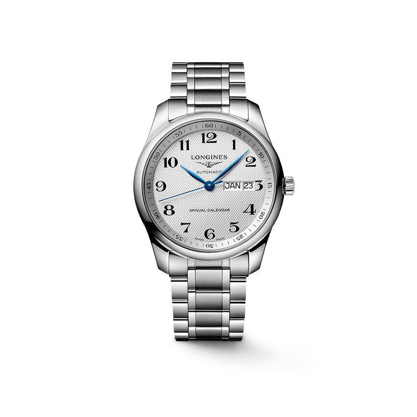 Výroční kalendář Longines Master Collection L2.910.4.78.6 , který kombinuje klasickou eleganci a technickou dokonalost, s plným kalendářem obsahuje nový automatický kalibr L897 ETA A31.L81 umístěný ve 40mm pouzdru z nerezové oceli. Přes skleněné pouzdro lze obdivovat Machineek s rezervou chodu 64 hodin a plným kalendářem ve 3 hodiny. Roční kalendář Longines Master Collection obsahuje roční kalendář, který automaticky upravuje datum pro měsíce s 30 a 31 dny (tato operace probíhá mezi 24:00 a 5:00). Nezahrnuje však skok únorového data, a proto se musí jednou ročně upravit ručně. Ocelové modře zbarvené ručičky vynikají na stříbřitém ciferníku s potiskem ječného ucha. Elegantní hodinky doplňuje náramek z nerezové oceli s bezpečnostním zapínáním.