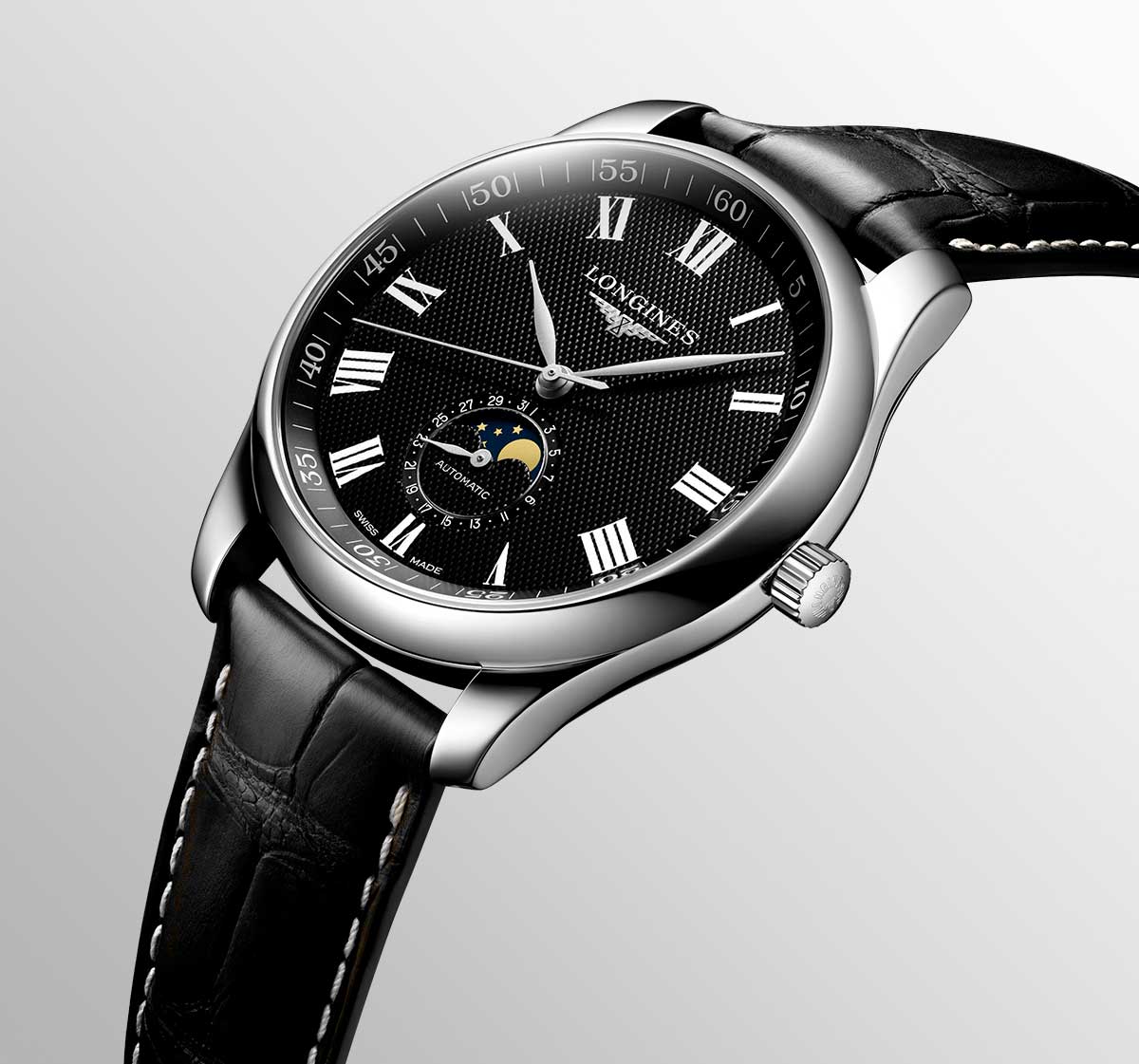 Pánské hodinky Longines Master Collection L2.919.4.51.7 kombinují klasickou eleganci s vynikající kvalitou, která vždy potěší muže, kteří ocení výjimečné řemeslné zpracování. Elegantní nerezové pouzdro o průměru 42 mm . V prodeji jsou i modely s menším průměrem 40 mm , pro osoby s menším zápěstím. Spodní strana Master Collection je opatřena sklem, které odhaluje krásně zpracovaný automatický Machineek. Kromě základního času ukazuje i fáze měsíce a datum. Ukazatel data je ve formě ukazatele ve spodní části číselníku. Ručičky v retro stylu jsou snadno čitelné a lze je otáčet přes černý ciferník s římskými číslicemi. Zakončeno exkluzivním páskem CITES aligátora s motýlkovou sponou na tlačítko. Existuje i verze s delším páskem XL Longines Master Collection L2.919.4.51.8 . Pokud si chcete tento model zakoupit, kontaktujte prosím servis.