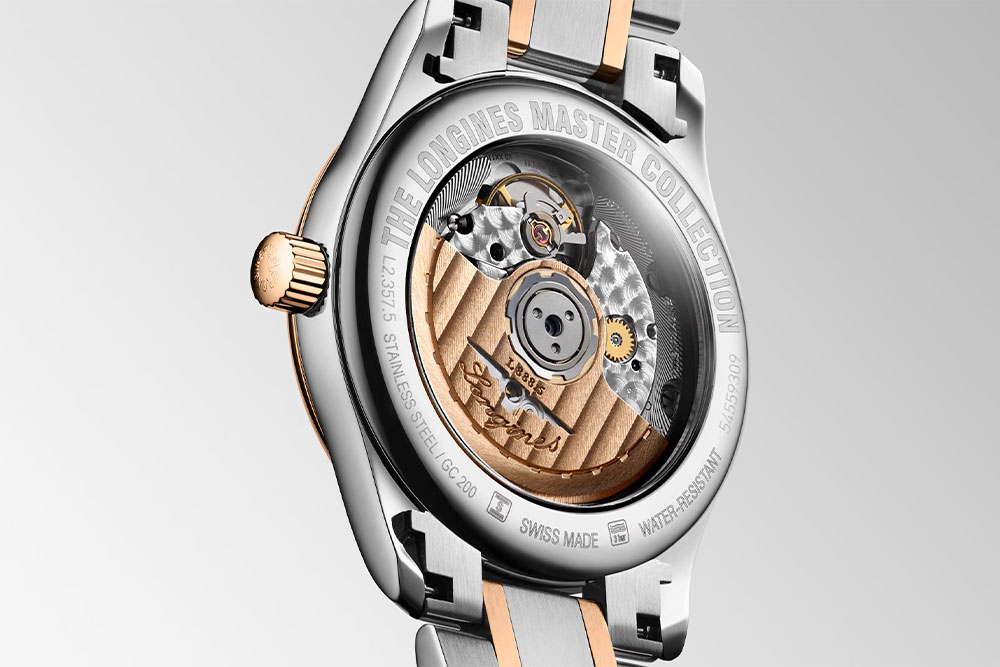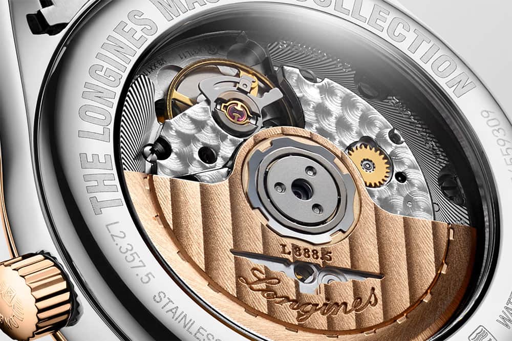 Na zadní straně pouzdra je zadní strana pouzdra se safírovým okénkem , které vám umožní obdivovat exkluzivní Machineek Longines kalibr L888 . Unikátní Machineek má antimagnetický křemíkový vyvažovací únik, díky kterému jsou hodinky chráněny před magnetickými poli, která mohou bránit chodu Machineku. Kalibr L888 poskytuje rezervu chodu až 72 hodin , což vám umožní odpočinout si od používání hodinek, aniž byste se museli bát, že je zastavíte.