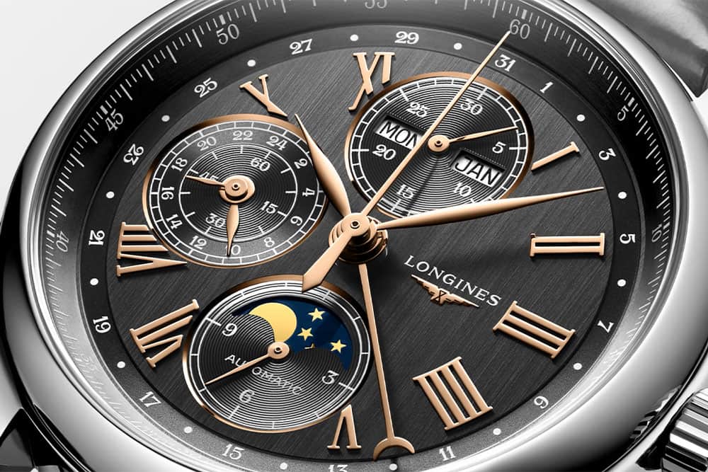 Pod safírovým sklíčkem odolným proti poškrábání je antracitový ciferník s římskými číslicemi a elegantní stříbrné ručičky. Ciferník byl obohacen o několik užitečných funkcí. Chronograf , který hodinkám dodává sportovní charakter. Rozšířený den-datum s názvem dne v týdnu a názvem měsíce ve dvanáct hodin. Na ciferníku je přídavná ručička s půlměsícem v jeho horní části, která označuje aktuální den v měsíci. V devět hodin se objevila funkce GMT – speciální subciferník vám umožní rychle odečíst čas ve městě v jiném časovém pásmu. Funkce GMT může být užitečná pro muže, jejichž život je cestování. V šest hodin je efektní funkce fáze měsíce - vyhrazený subciferník zdobí jiskřivé hvězdy na noční obloze a měsíc v každé z jeho fází.