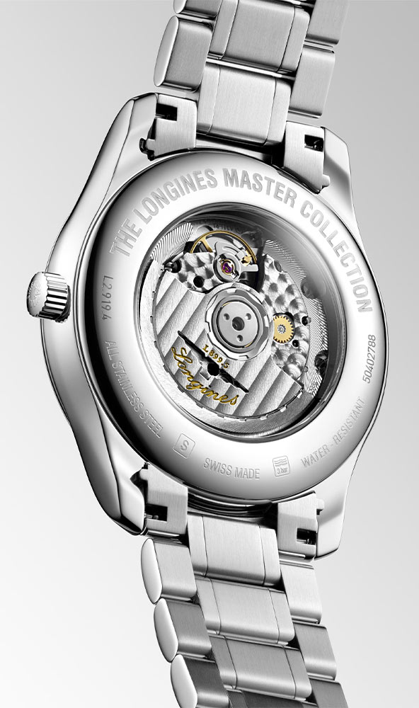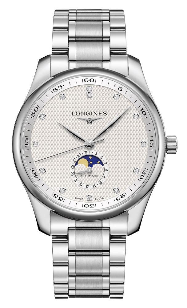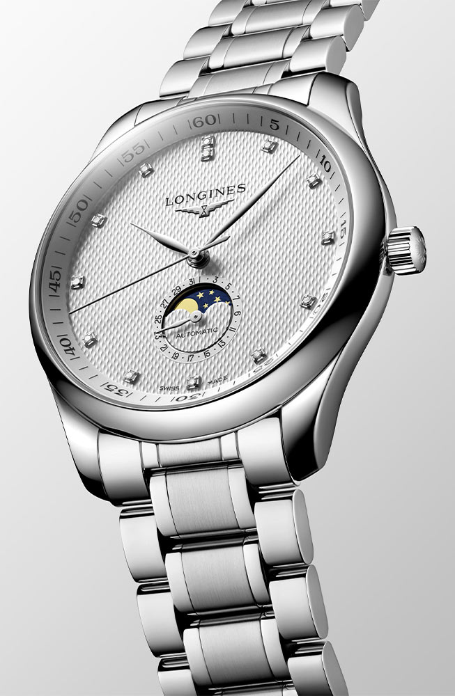 Pouzdro hodinek je vyrobeno z nerezové oceli o průměru 42 mm a bylo utěsněno až na 30 metrů. Stříbrný ciferník s ozdobnou gilošou obsahuje hodinové indexy v podobě 13 diamantů 0,059 ct. Ciferník je vybaven funkcí fáze měsíce a datumovým okénkem na pozici šesté hodiny. Celý je chráněn safírovým sklem vysoce odolným proti poškrábání a poškození. Uvnitř pouzdra je automatický Machineek kalibr L899, který zaručuje přesné měření času a rezervu chodu až 72 hodin. Longines Master Collection je spárována se stříbrným náramkem. Pohodlí a bezpečnost při nošení zajistí motýlková spona.