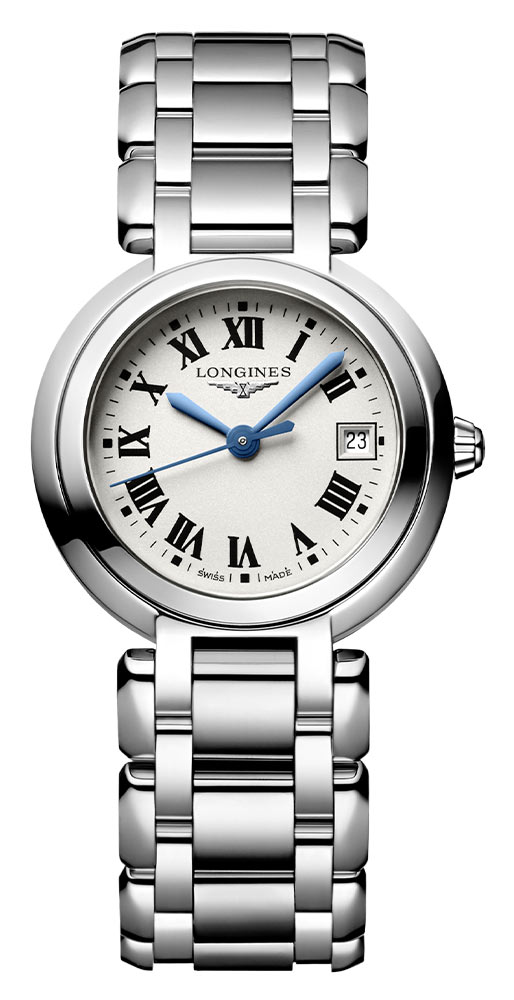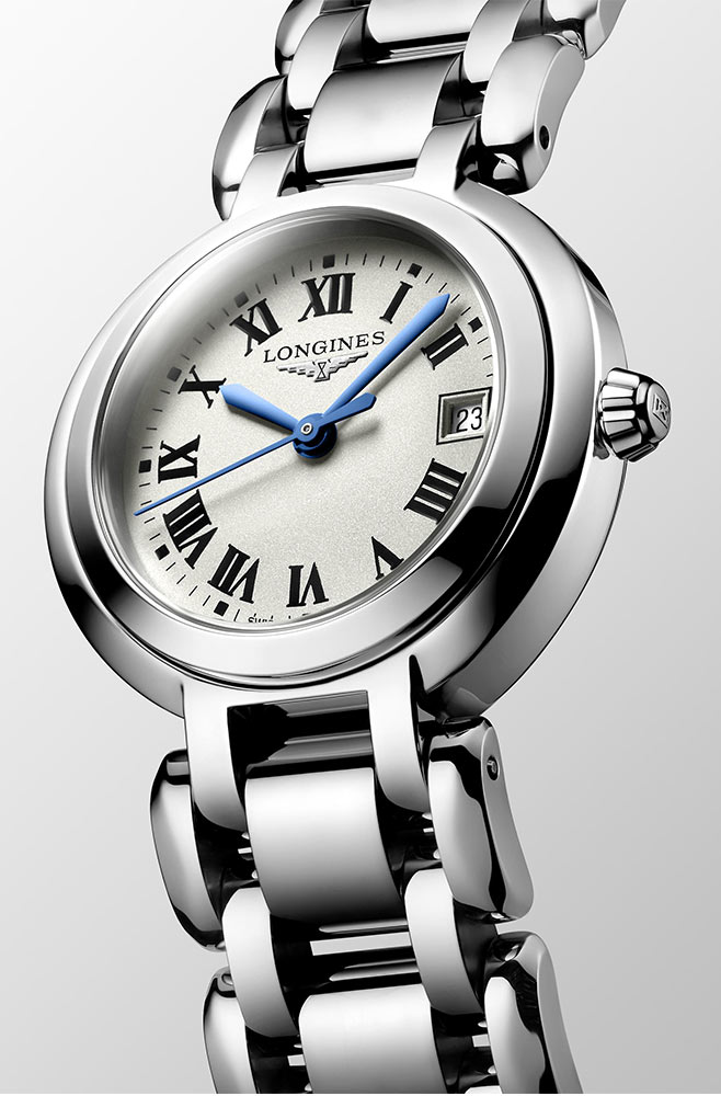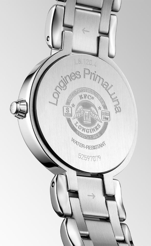 Longines PrimaLuna je kulaté pouzdro z nerezové oceli o velikosti 26,50 mm. Na pravé straně je pohodlná, elegantní krajka. Pouzdro bylo utěsněno až do 30 metrů. Na uších je připevněn ocelový náramek stříbrné barvy s bezpečnou a pohodlnou motýlkovou sponou. Bílý ciferník kryje safírové sklíčko vysoce odolné proti poškrábání s antireflexní vrstvou. Ve tři hodiny je malé datumové okénko s aktuálním dnem v měsíci. Pod ciferníkem hodinek Longines se ukrývá quartzový Machineek - výrobce vybavil časomíru přesným kalibrem L152 s funkcí End of Life. EOL bude majitele časomíry informovat o nutnosti výměny baterie, která tento model napájí.