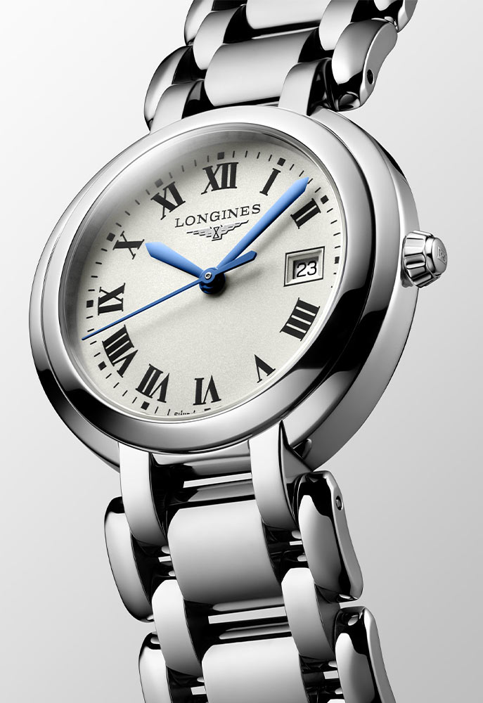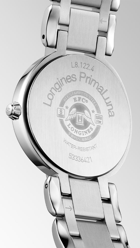 Longines PrimaLuna je kulaté pouzdro z nerezové oceli o průměru 30 mm. Na pravé straně je pohodlná, elegantní krajka. Pouzdro bylo utěsněno až do 30 metrů. Na uších je připevněn ocelový náramek stříbrné barvy s bezpečnou a pohodlnou motýlkovou sponou. Safírové sklíčko vysoce odolné proti poškrábání s antireflexní vrstvou kryje stříbrný ciferník s římskými číslicemi a elegantní modré ručičky. Ve tři hodiny je malé datumové okénko s aktuálním dnem v měsíci. Pod ciferníkem hodinek Longines se ukrývá quartzový Machineek - výrobce vybavil časomíru přesným kalibrem L152 s funkcí End of Life. EOL bude majitele časomíry informovat o nutnosti výměny baterie, která tento model napájí.