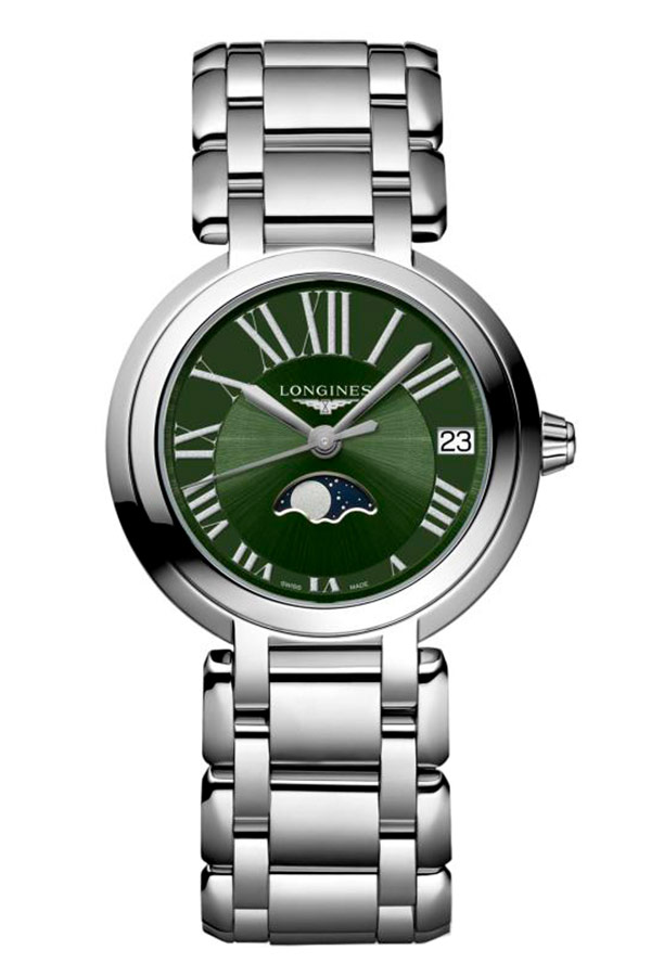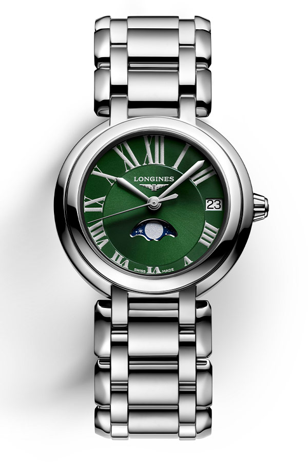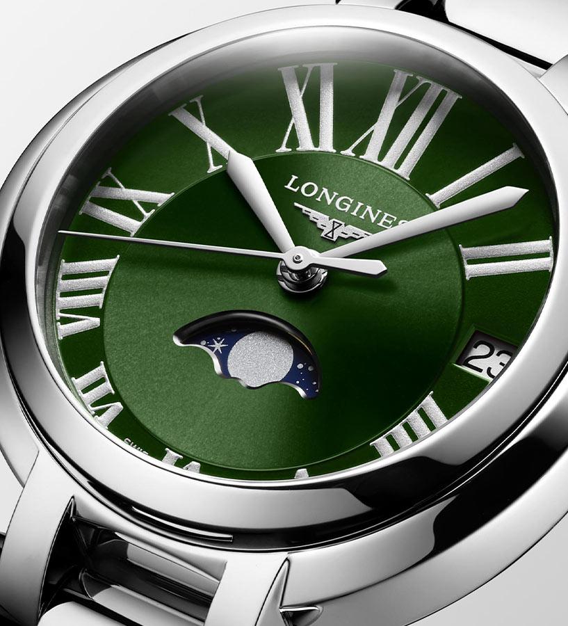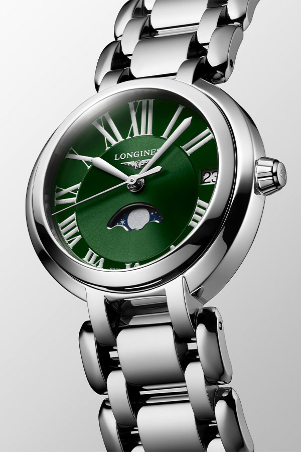 Longines PrimaLuna Moon Phase L8.115.4.61.6 přidává další hvězdu do kolekce švýcarské značky. Kulaté jemné linie a funkce fáze měsíce Longines PrimaLuna Moon Phase vzdávají hold stříbrné hvězdě. Jemnou siluetu umocňuje rafinovaný elegantní zelený ciferník a celek zdůrazňuje úžasný měsíc na modrém pozadí umístěný na šesté hodině. Elegantní, kouzelný model svádí ženy, které ocení nadčasovou, sofistikovanou eleganci. Vyhlazené tvary a pohyblivé články náramku dodávají při nošení pocit luxusu.