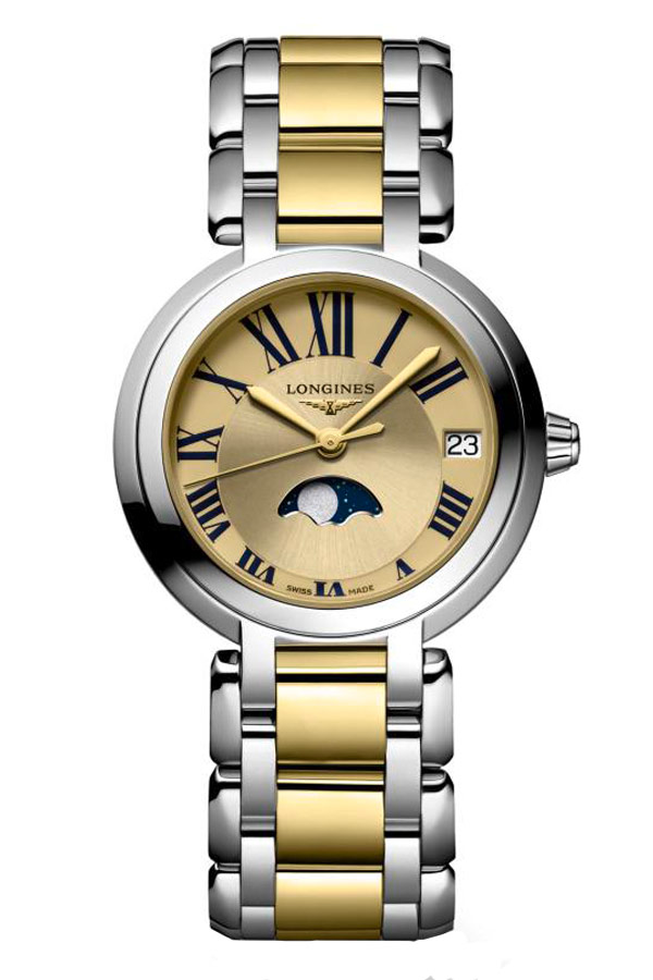 Longines PrimaLuna Moon Phase L8.115.5.31.7 přidává do kolekce švýcarské značky další hvězdu. Kulaté jemné linie a funkce fáze měsíce Longines PrimaLuna Moon Phase vzdávají hold stříbrné hvězdě. Jemnou siluetu umocňuje rafinovaný elegantní ciferník zlaté barvy a celek zdůrazňuje úžasný měsíc na modrém pozadí umístěný na šesté hodině. Elegantní, kouzelný model svádí ženy, které ocení nadčasovou, sofistikovanou eleganci. Hladké části pouzdra a některé články náramku jsou vyrobeny z 18K žlutého zlata, které při nošení působí luxusním dojmem.