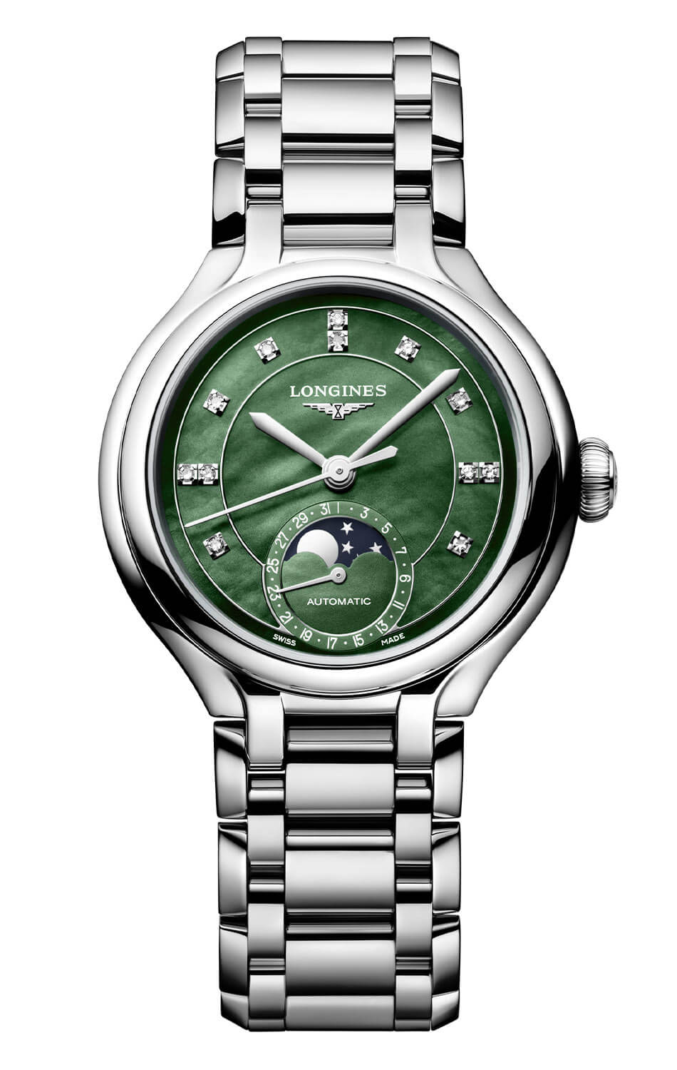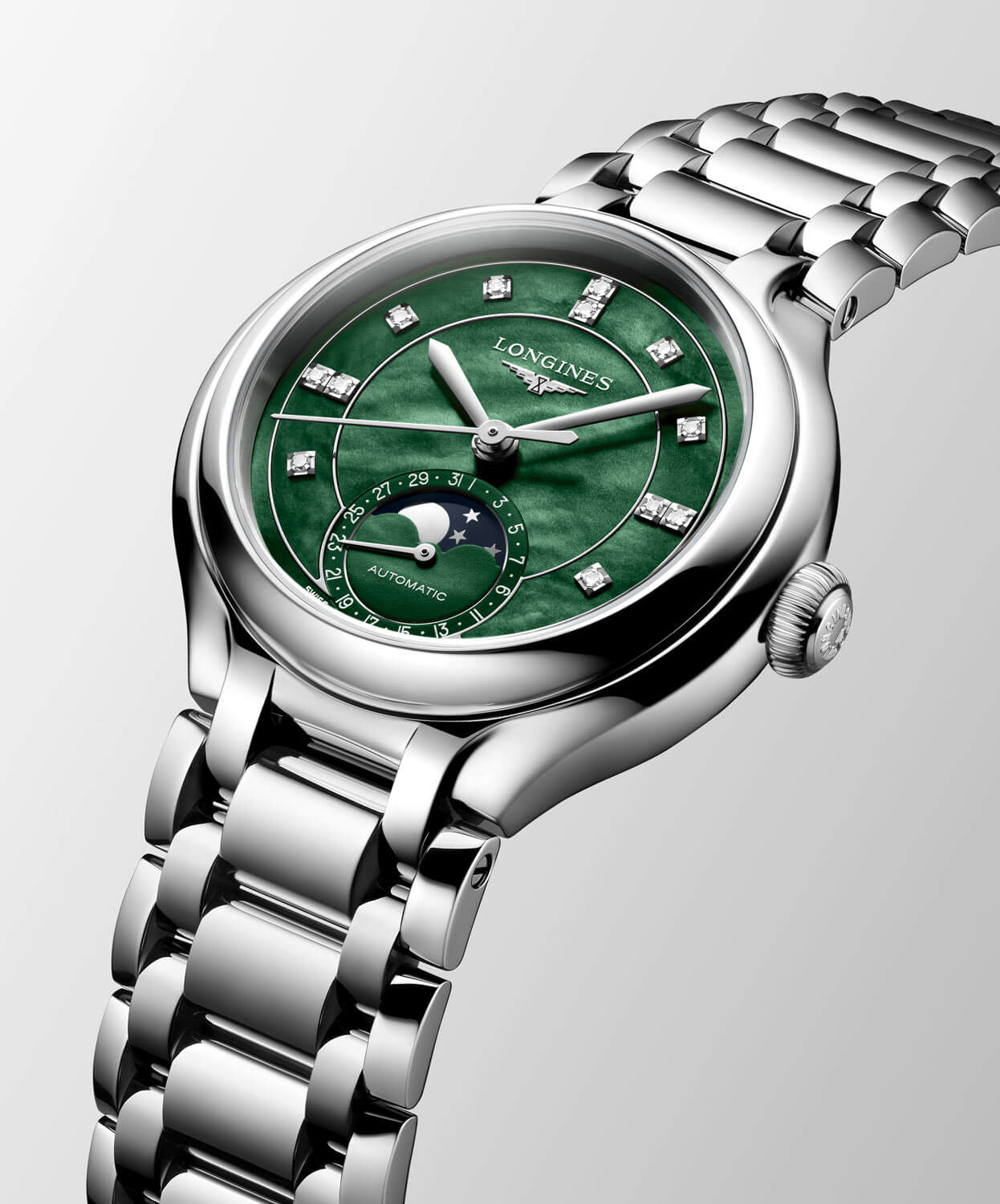 Uprostřed kompozice se nachází perleťový ciferník v hlubokém odstínu zelený, zdobený dvanácti diamantovými indexy a klasickými ručkami. Ciferník chrání odolné safírové sklíčko s antireflexní vrstvou, zatímco zespodu je hodinkám zajištěno ocelové víko se safírovým okénkem, které umožňuje pohled na autorský rotor s logem Longines i na jednotlivé komponenty strojku.